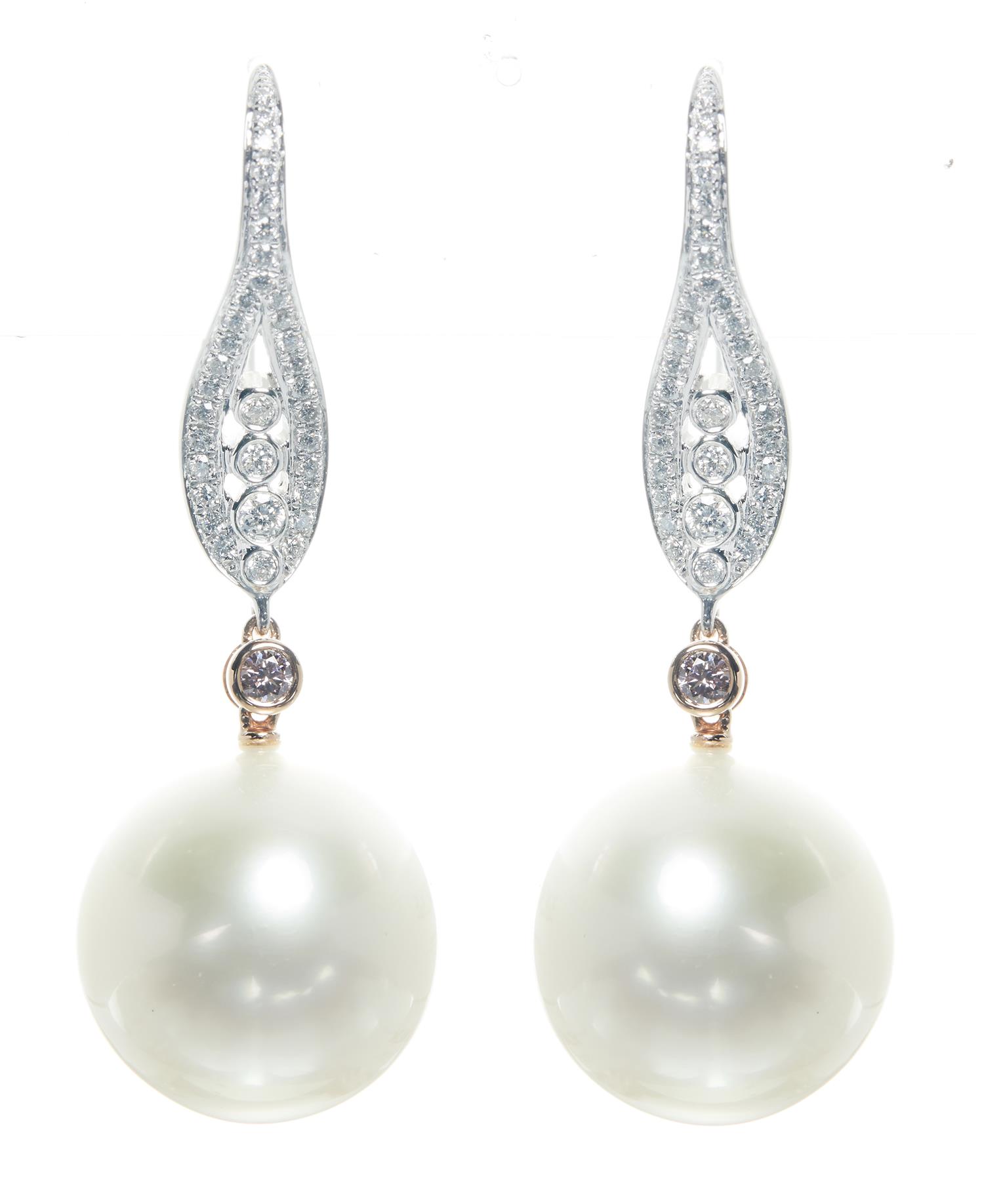 Each terminating on an off-round cultured pearl swing drop measuring approximately 16.00mm supported from an openwork surmount, decorated with brilliant-cut diamonds between a collet-set natural fancy pink brilliant-cut diamond connector, the pink and colourless diamonds together weighing approximately 0.66 carats, length approximately 47mm, wire fittings.