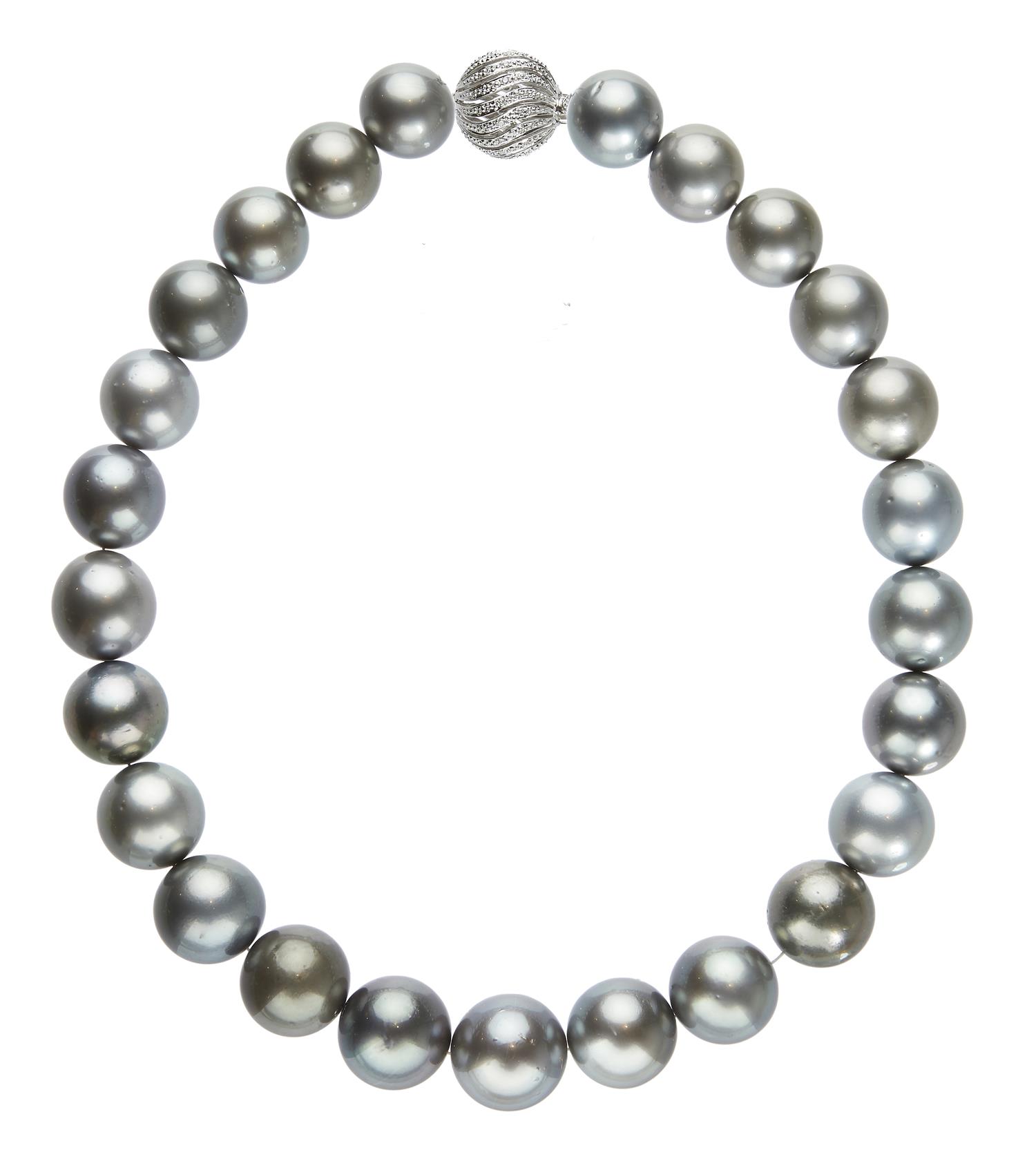 Composed of 25 cultured pearls of grey hue, graduating from approximately 18.0-16.0 mm, completed by an 18ct white gold openwork ball clasp pavé-set with brilliant-cut diamonds, together weighing approximately 0.10 carats, circumference 460mm.