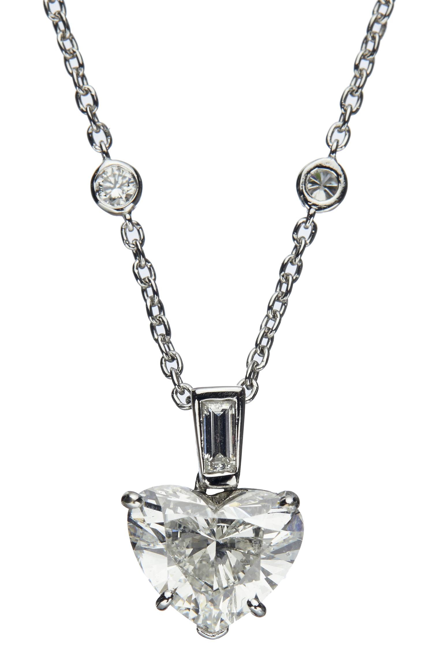 Claw-set with a heart-shaped diamond weighing 2.12 carats, supported from a surmount decorated with a tapered baguette diamond completed by a fine trace chain decorated at intervals with spectacle-set brilliant-cut diamonds, chain circumference approximately 380mm.