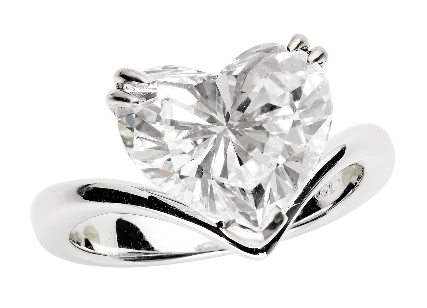 Claw-set with a heart brilliant-cut diamond weighing 5.06 carats, size K.
