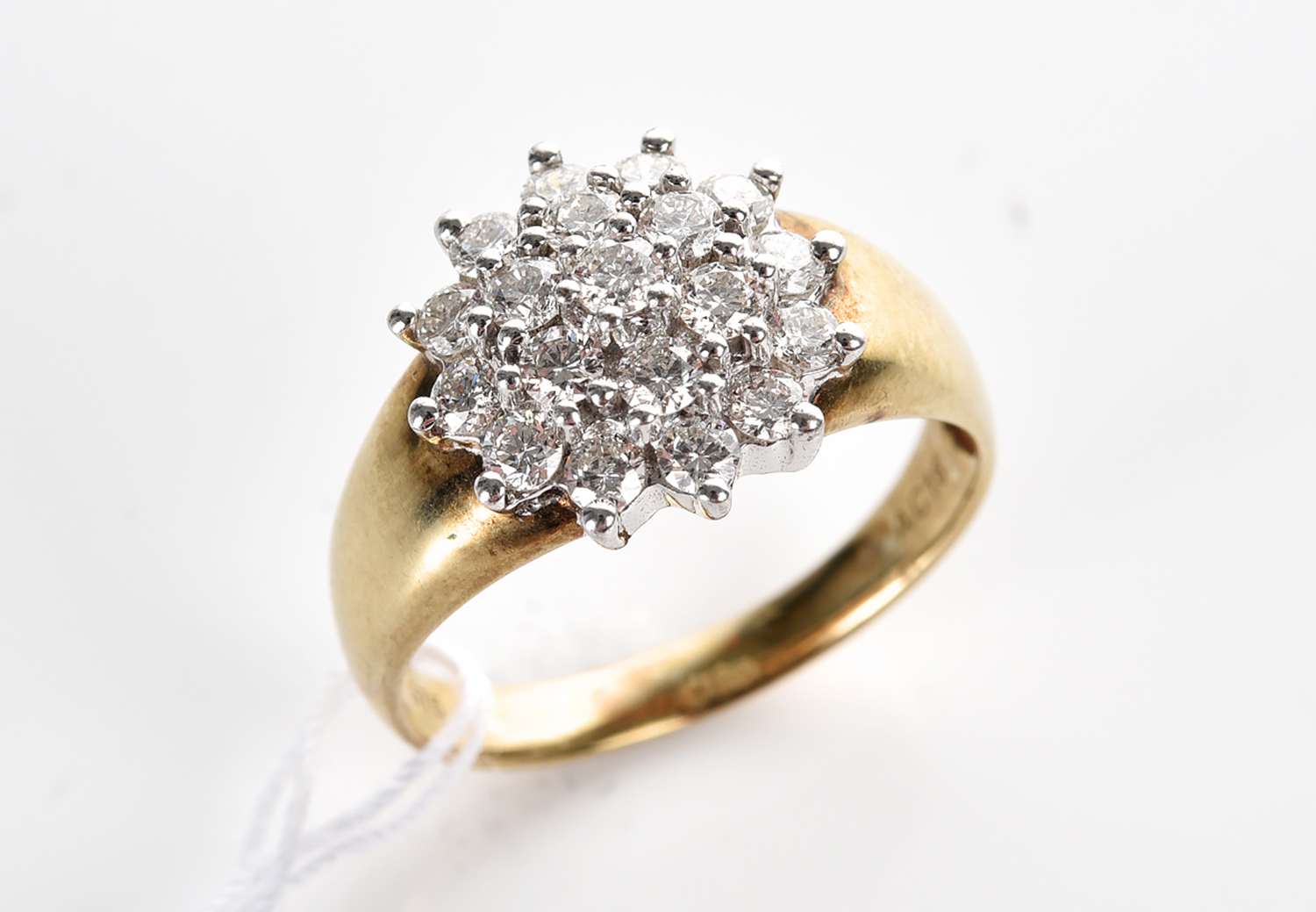 A DIAMOND CLUSTER RING, TOTALLING 1.05CT, IN 9CT GOLD, SIZE R-S, 3.5GMS