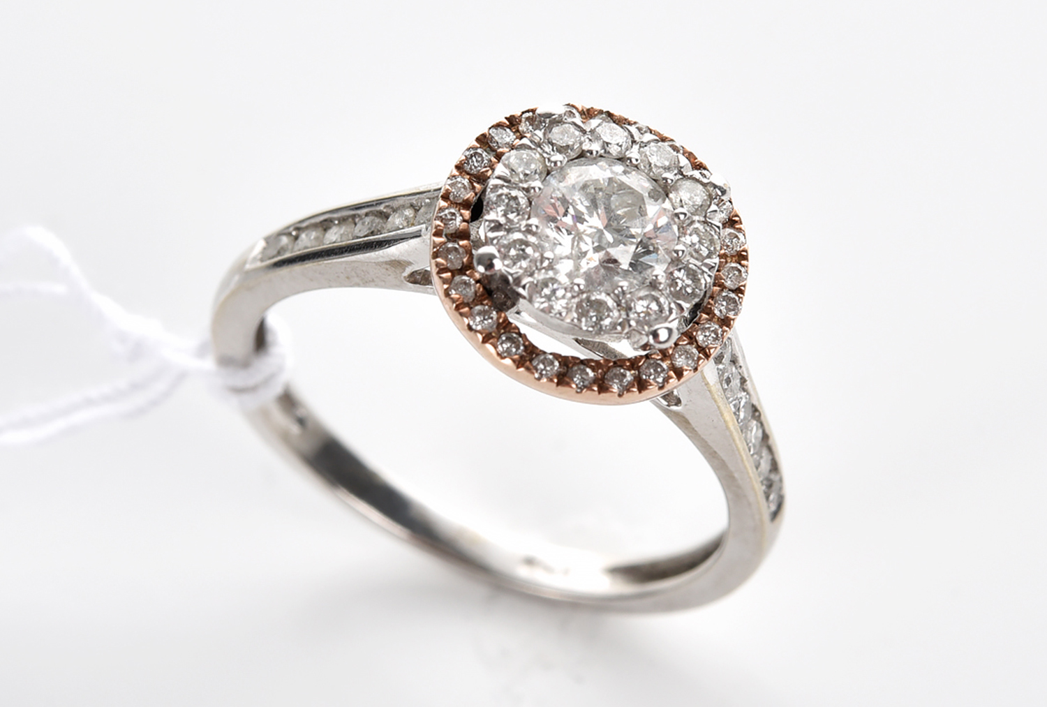 A DIAMOND HALO RING IN 9CT GOLD, DIAMONDS TOTALLING 0.65CT, SIZE N, 2.5GMS