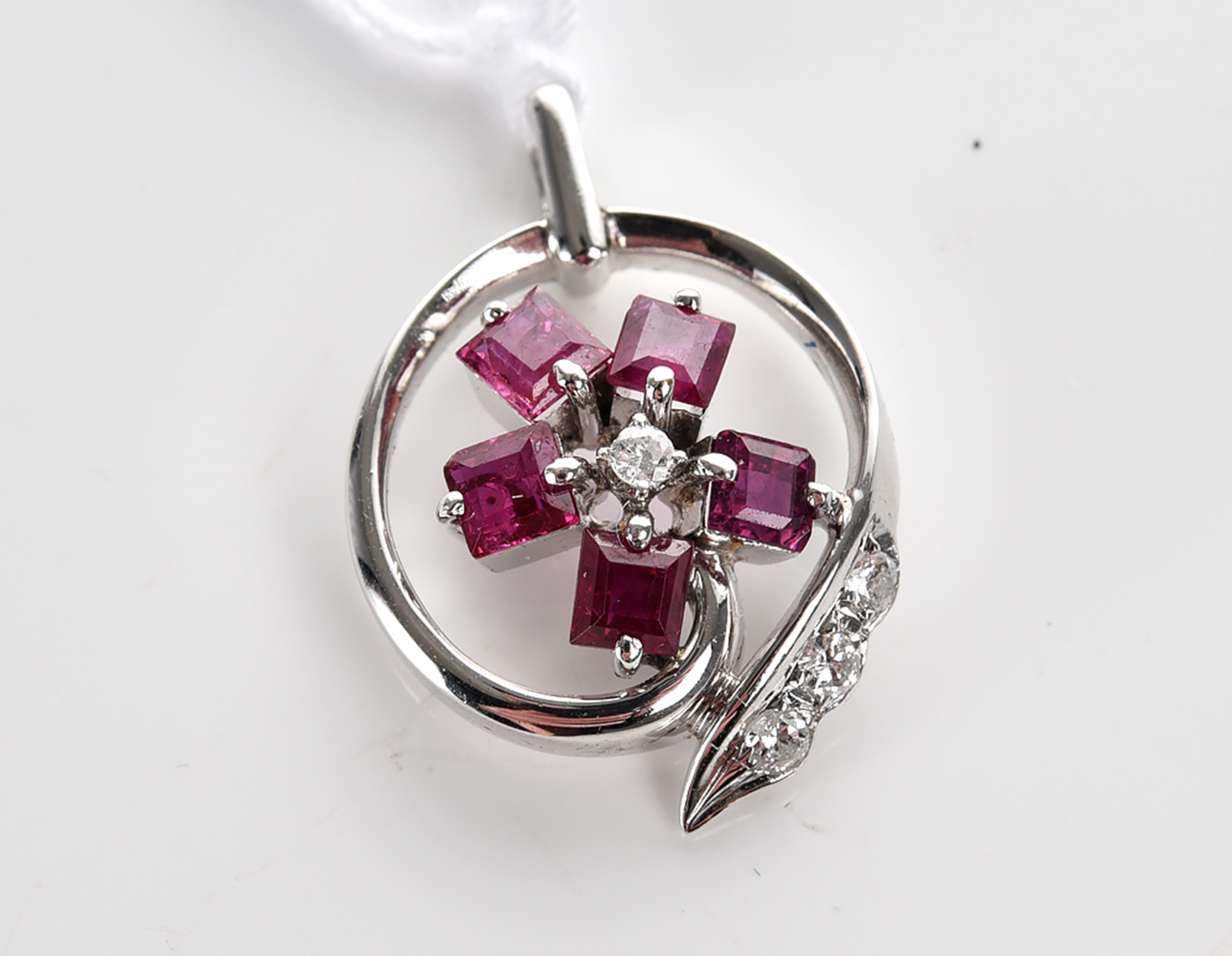 A RUBY AND DIAMOND PENDANT IN 14CT WHITE GOLD, LENGTH 20MM, 2.1GMS