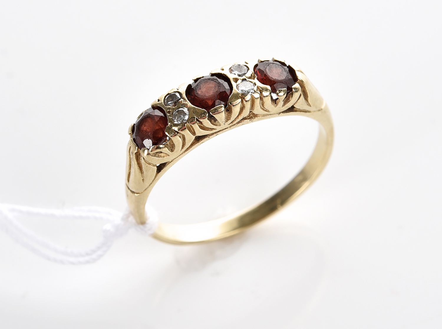 A GARNET AND DIAMOND RING IN 9CT GOLD, SIZE J-K, 2GMS