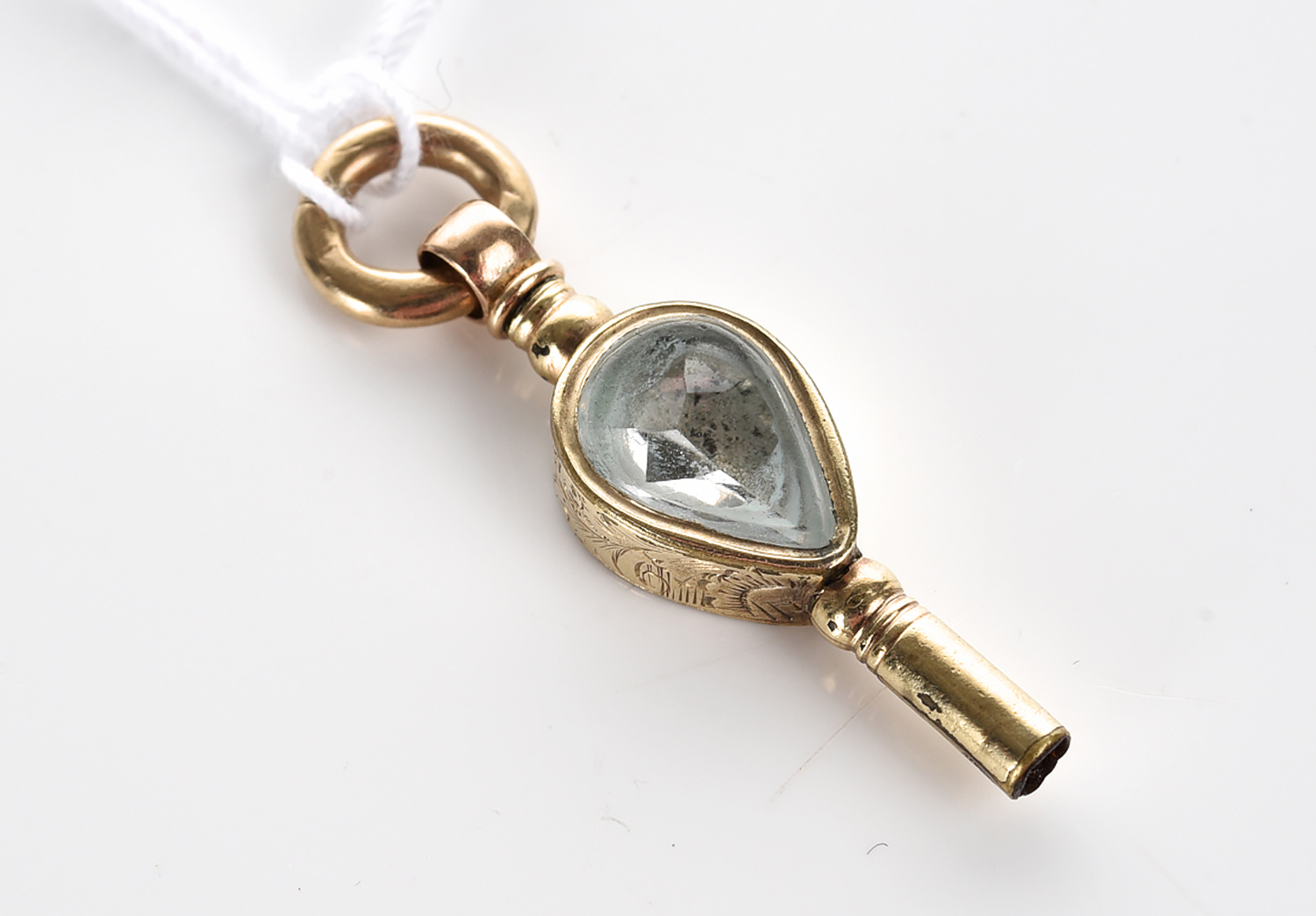 AN ANTIQUE GOLD CASED AND FOIL BACKED QUARTZ SET POCKET WATCH KEY, LENGTH 3CM, 1.8GMS
