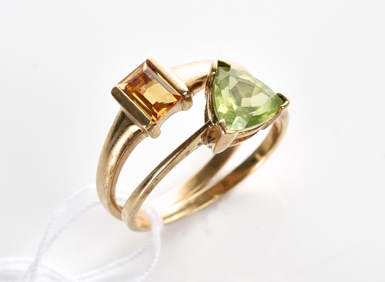 A CITRINE RING TOGETHER WITH A PERIDOT RING BOTH IN 9CT GOLD, SIZE N-O, 3.5GMS