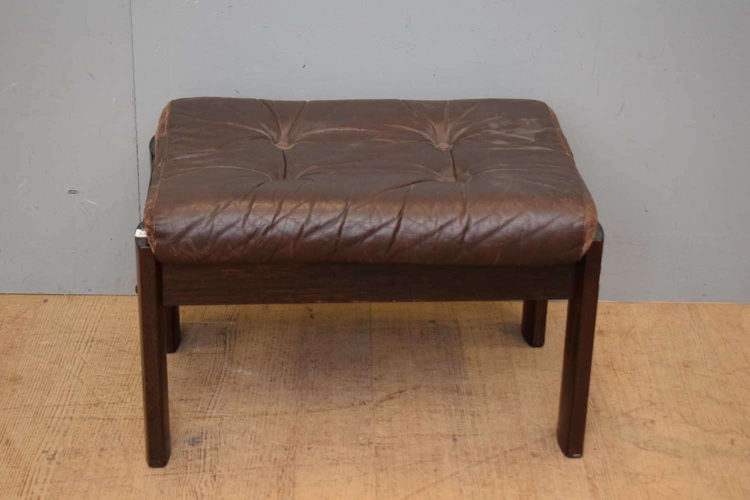 A DANISH TEAK AND LEATHER STOOL (40H X 63W X 48D CM)
