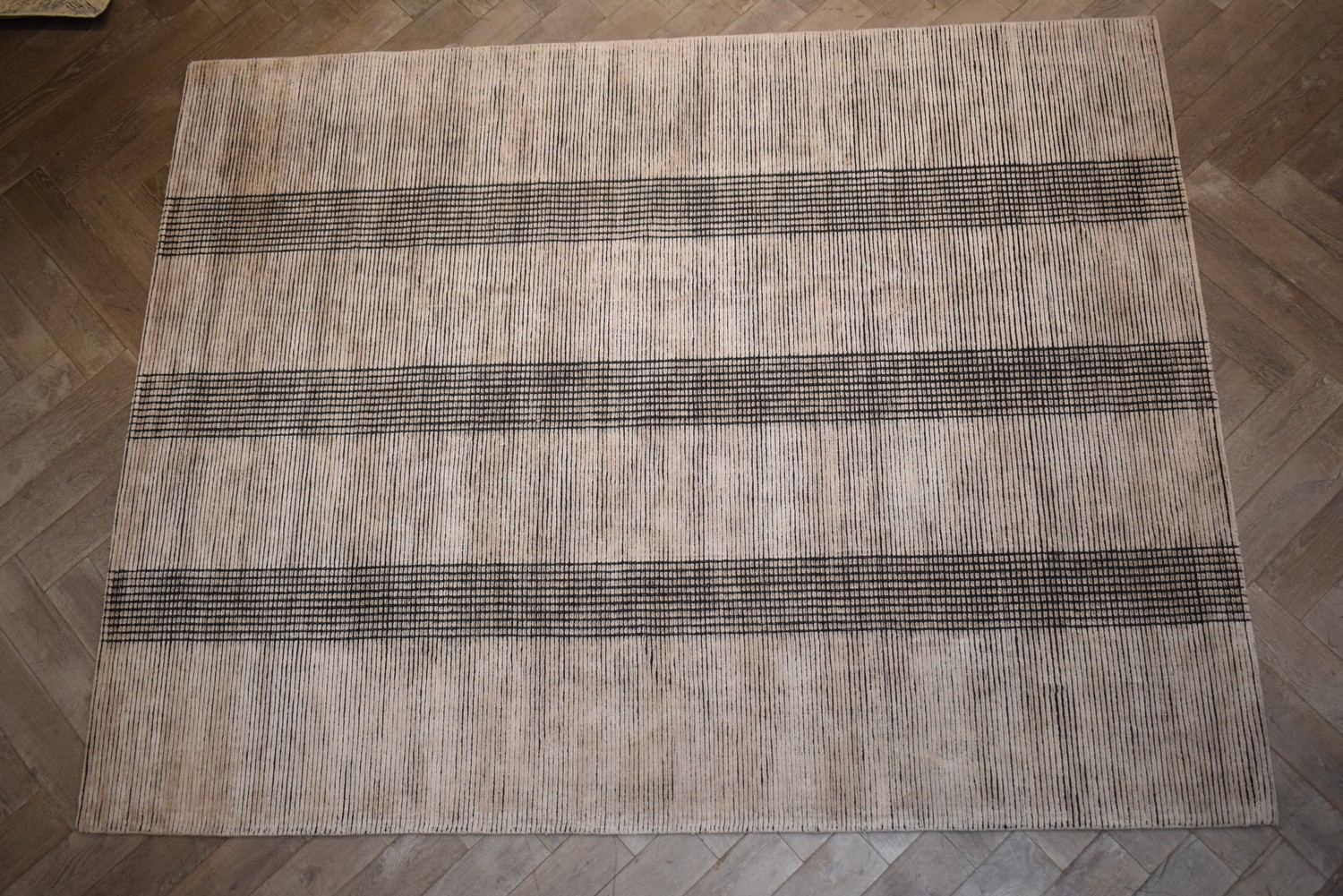 A MODERN WOOL & VISCOSE SILK TEXTURE DESIGNER CARPET. HAND-TUFTED & WITH EMBOSSED STRIPED PATTERN IN SHADES OF BEIGE & CHARCOAL. IN GOOD CLEAN CONDITION. SIZE: 300X245CM ORIGIN: INDIA