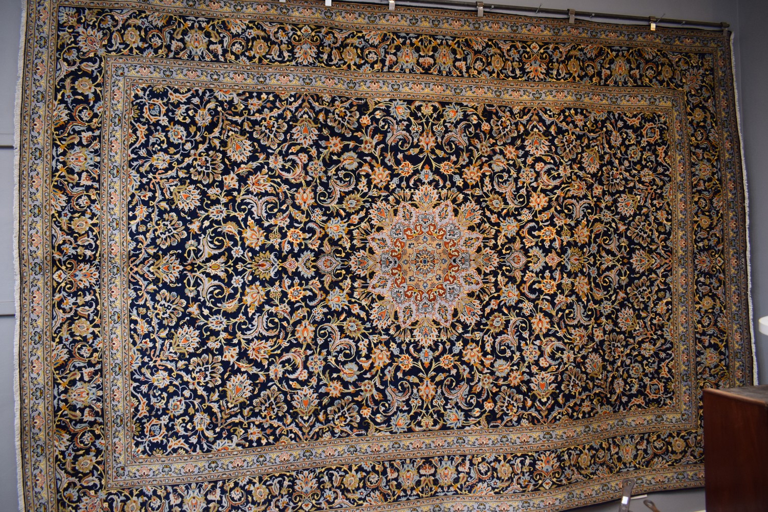 A "RABANI" MASTERWORK-SHOP ATELIER PERSIAN ROYAL KASHAN. 100% WOOL. DENSE PILE. FINELY HAND-KNOTTED ATELIER WEAVE. KASHAN DESIGN OF BOLD SUNBURST MEDALLION IN A ROYAL BLUE FIELD OF SHAH ABBASSI PALMETTES, FLORAL MOTIFS & SAZ LEAVES. BORDER OF PALMETTES & FLORAL MOTIFS. EX-GALLERY EXHIBITED. IN SUPERB CONDITION. CERTIFICATE OF AUTHENTICITY INCLUDED. SIZE: 420X295CM ORIGIN: PERSIA - RRP: $8,500