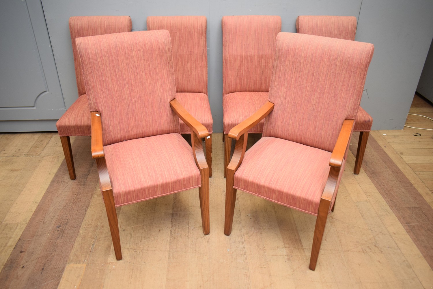 A SET OF SIX SCROLL BACK DINING CHAIRS INCLUDING TWO CARVERS (SUN FADING TO FABRIC) (CARVERS 104H X 55W X 62D CM) (LARGE ITEM)
