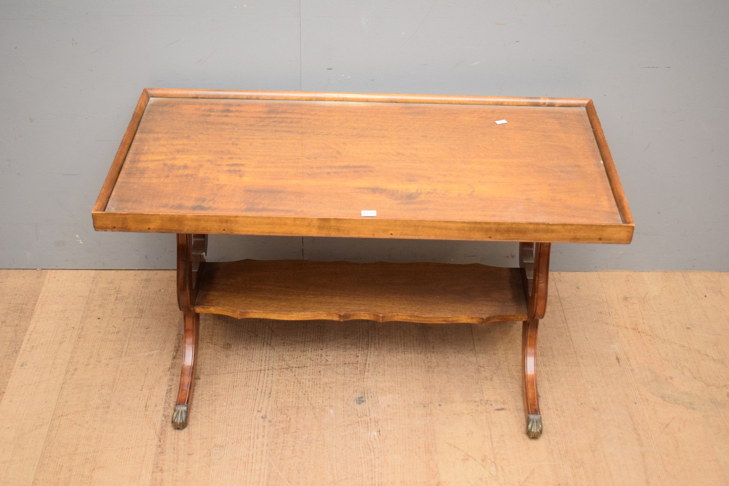 A WOODEN COFFEE TABLE WITH INSET GLASS TOP AND CLAW FOOT LEGS (49H X 93W X 48D CM)