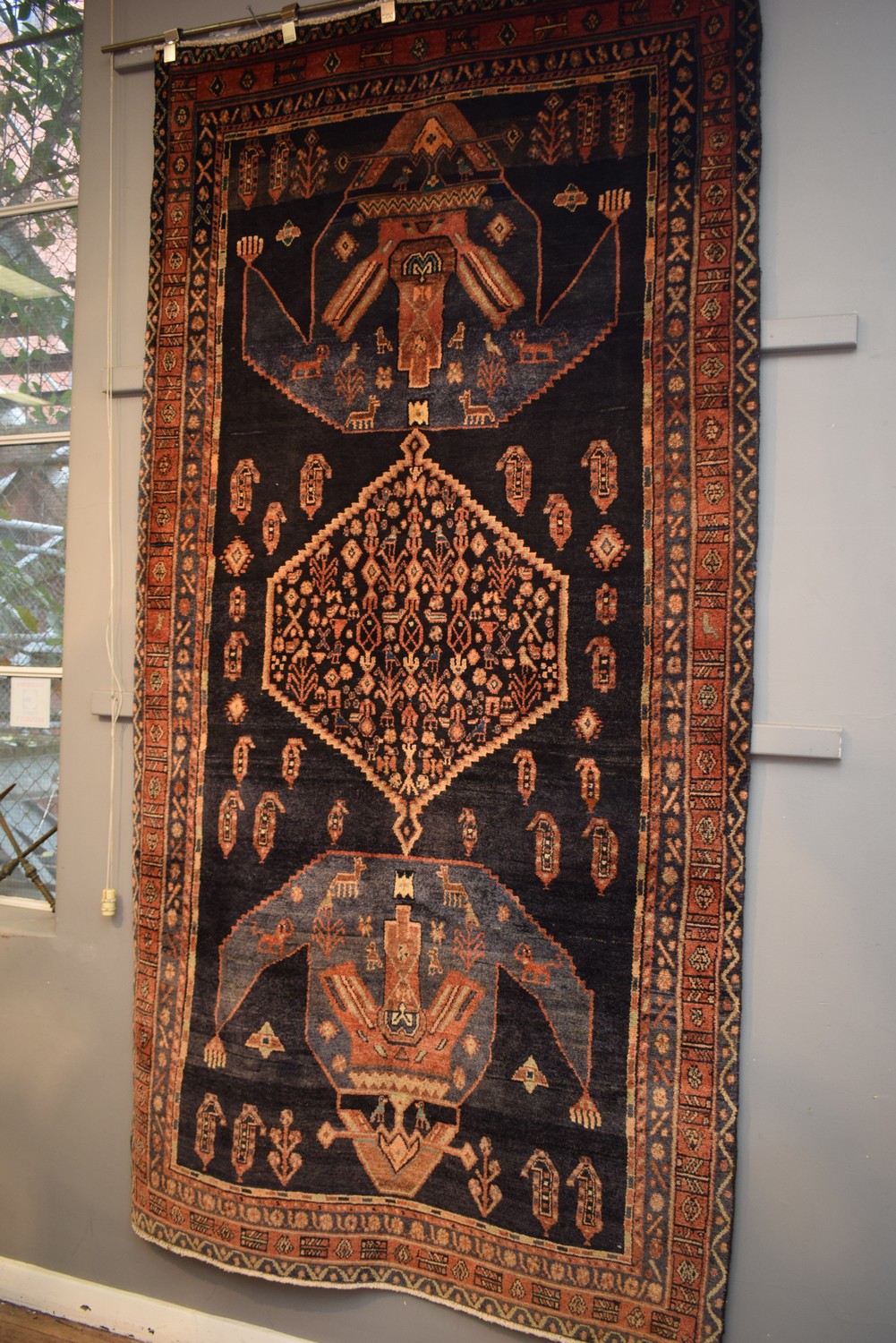 A UNIQUE PERSIAN SONQOR RUG, 100% WOOL. DENSE PILE. NATURAL DYES WITH ABRASH DISCOLORATION. EX-GALLERY EXHIBITED. IN EXCELLENT CONDITION. HAND-KNOTTED VILLAGE WEAVE WITH RARE DESIGN OF HEXAGONAL ANCHORED MEDALLION CONTAINING HERATI MAHI MOTIFS & ANIMAL FORMS IN A FIELD OF PAISLEY MOTIFS. CERTIFICATE OF AUTHENTICITY INCLUDED. SIZE: 284X152CM ORIGIN: PERSIA - RRP: $2,900