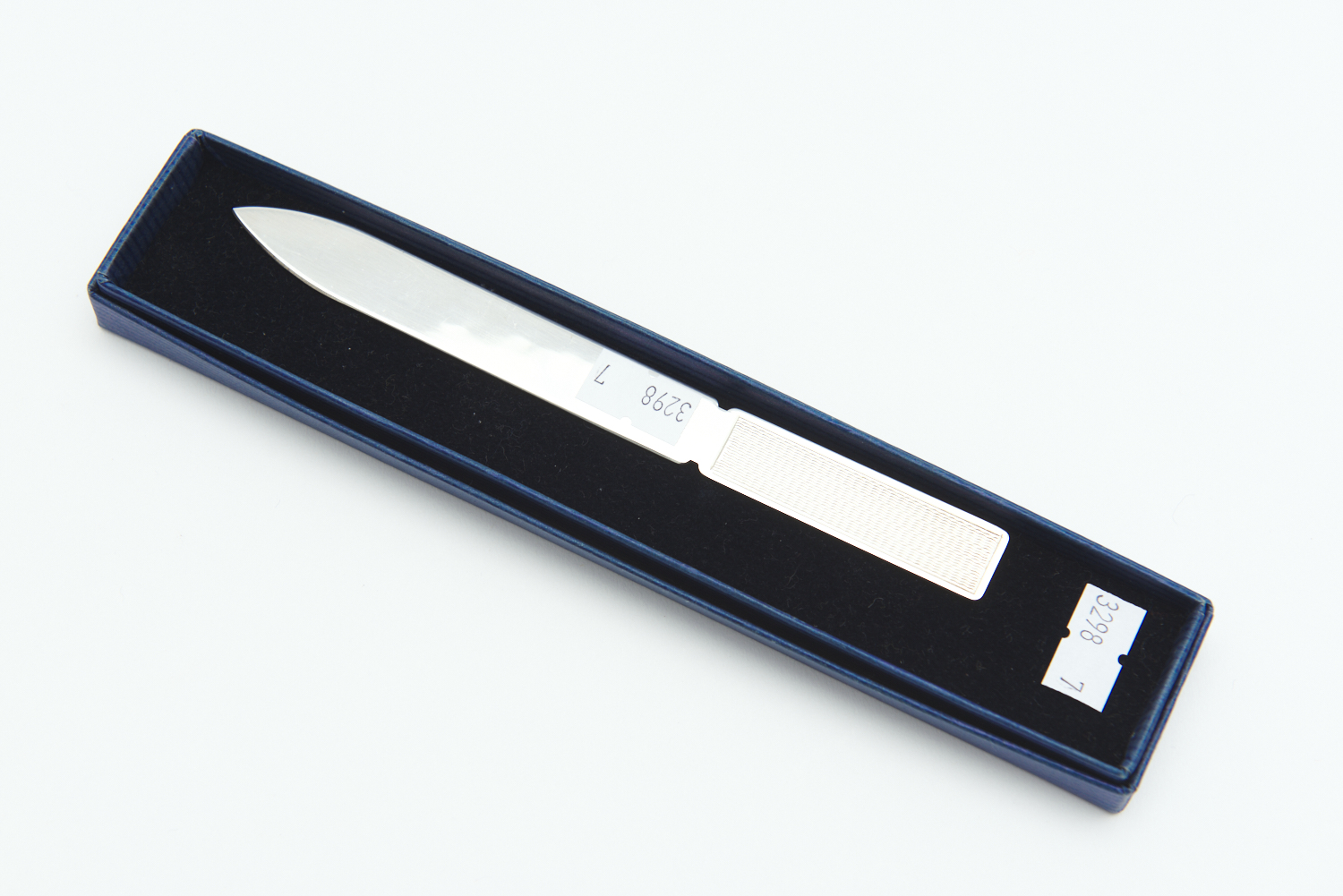 A BOXED STERLING SILVER LETTER OPENER WITH ENGINE TURNED HANDLE L.16.5CM