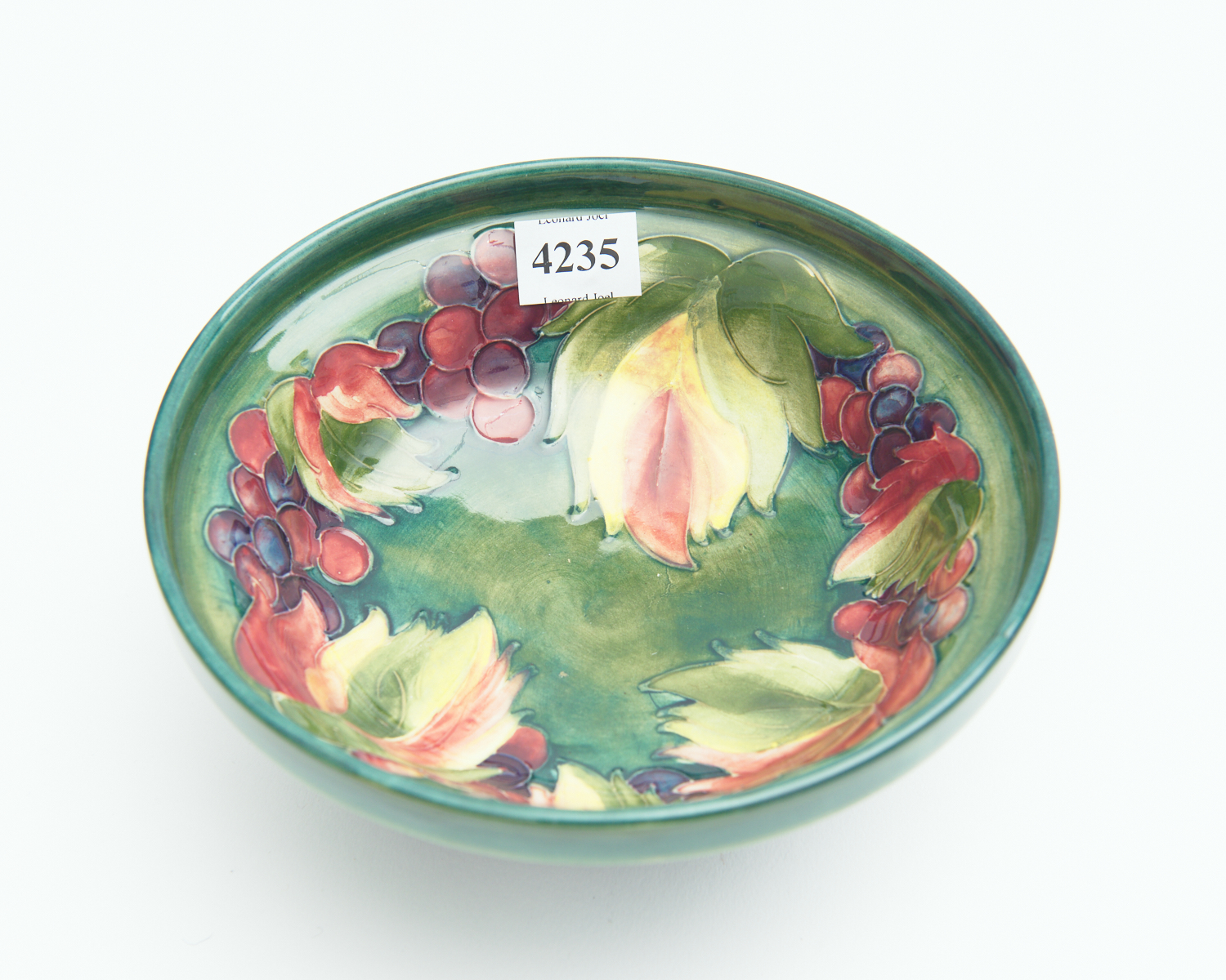 A MOORCROFT BERRY AND LEAF PATTERN BOWL WITH GREEN GROUND, 16.5 CM DIAMETER