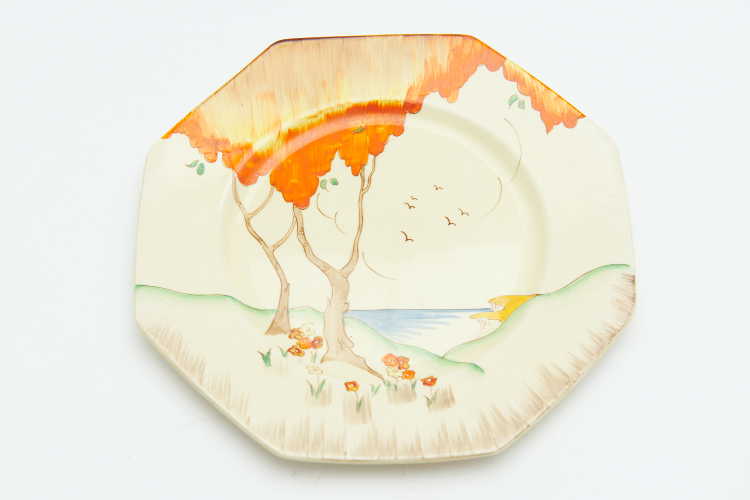 A CLARICE CLIFF HONEY GLAZE PLATE, A. J. WILKINSON LTD, ROYAL STAFFORDSHIRE, 21.5 CM WIDE
