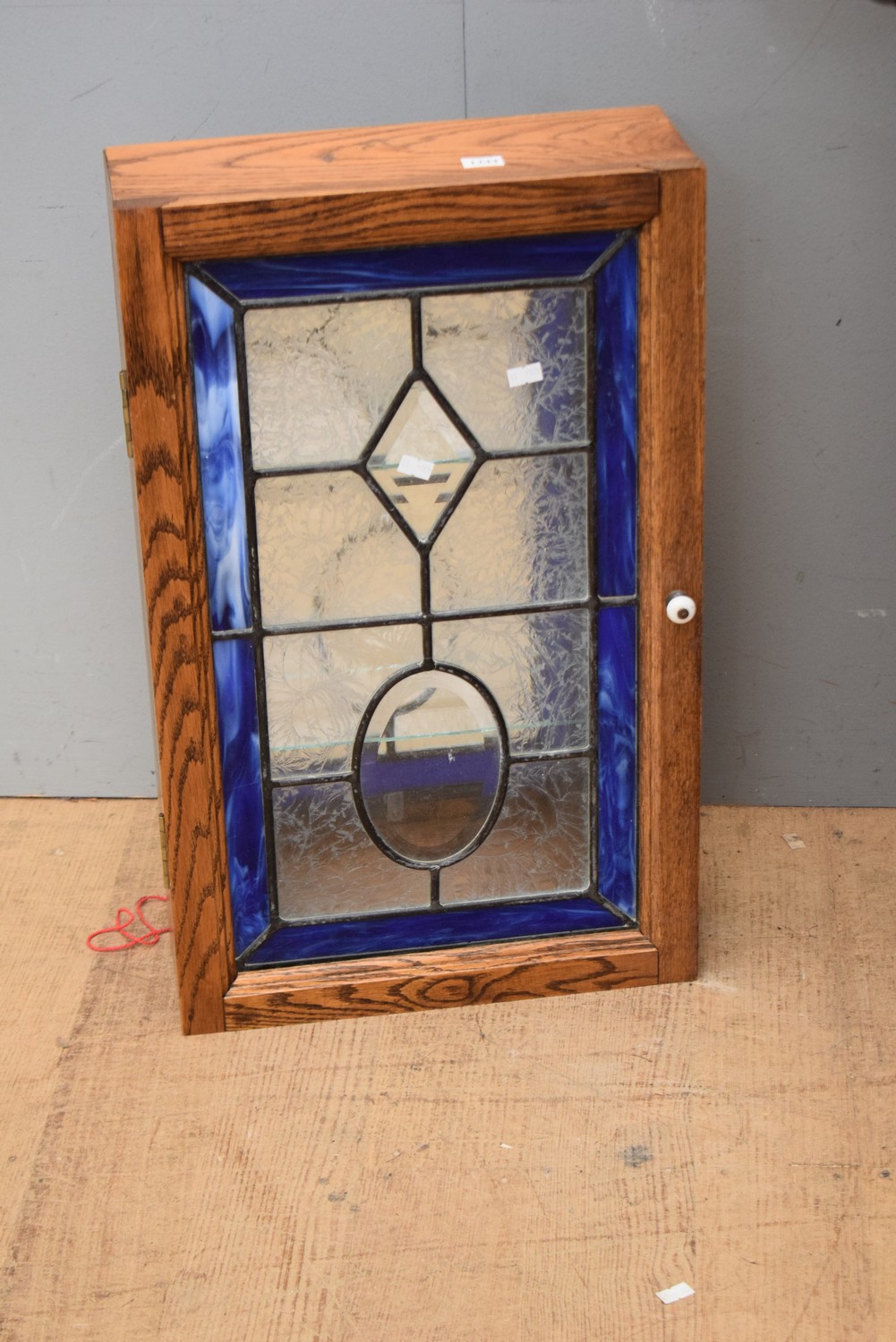 A 1940S OAK FRAMED STAINED GLASS FRONTED CABINET WITH TWO GLASS SHELVES (60H X 36W X 13D CM)
