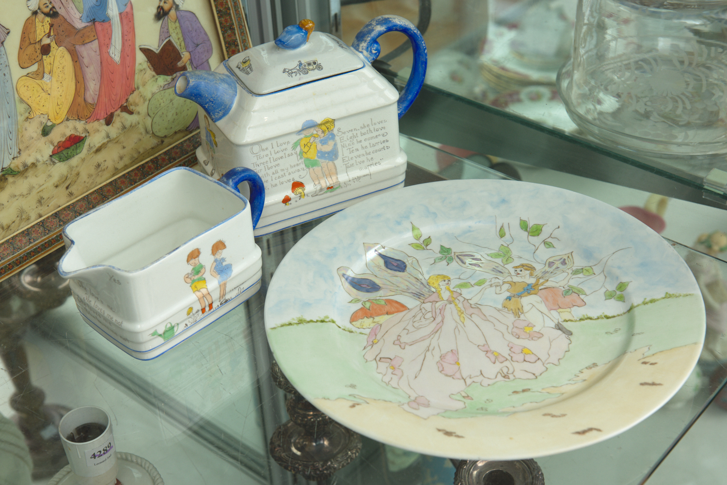 AN ENGLISH PARAGON NURSERY WARE TEAPOT AND JUG ILLUSTRATED BY JA ROBINSON TOGETHER WITH FAIRY PLATE