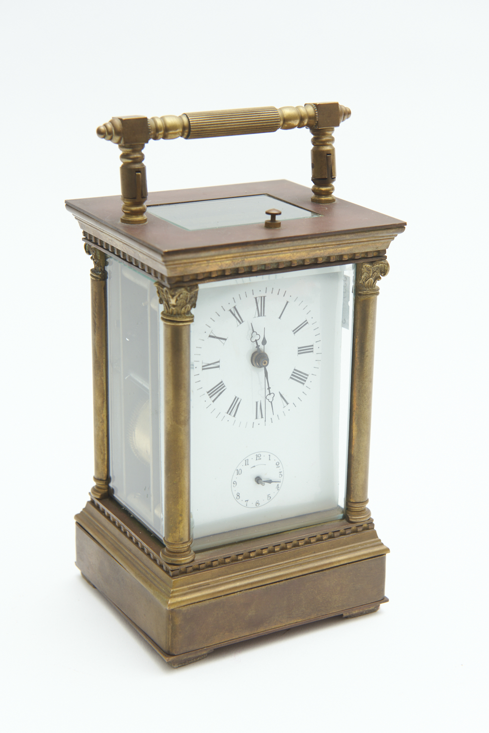 A CARRIAGE CLOCK COLONIAL STYLE WITH ALARM, 20 CM HIGH