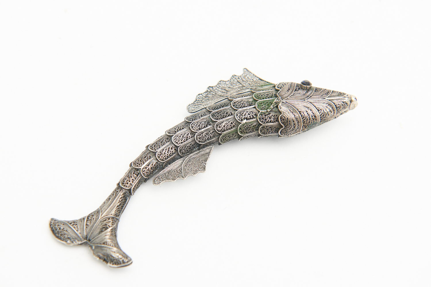 A WIRE FILIGREE MODEL OF A FISH WITH SEMI-PRECIOUS STONE EYE (ONE EYE MISSING) L.14CM (SMALL DELIVERY)