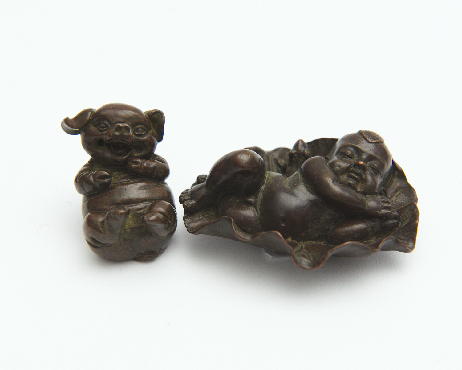 TWO SMALL BRONZE FIGURES: PIG AND BOY ON LOTUS, SIGNED (SMALL DELIVERY)