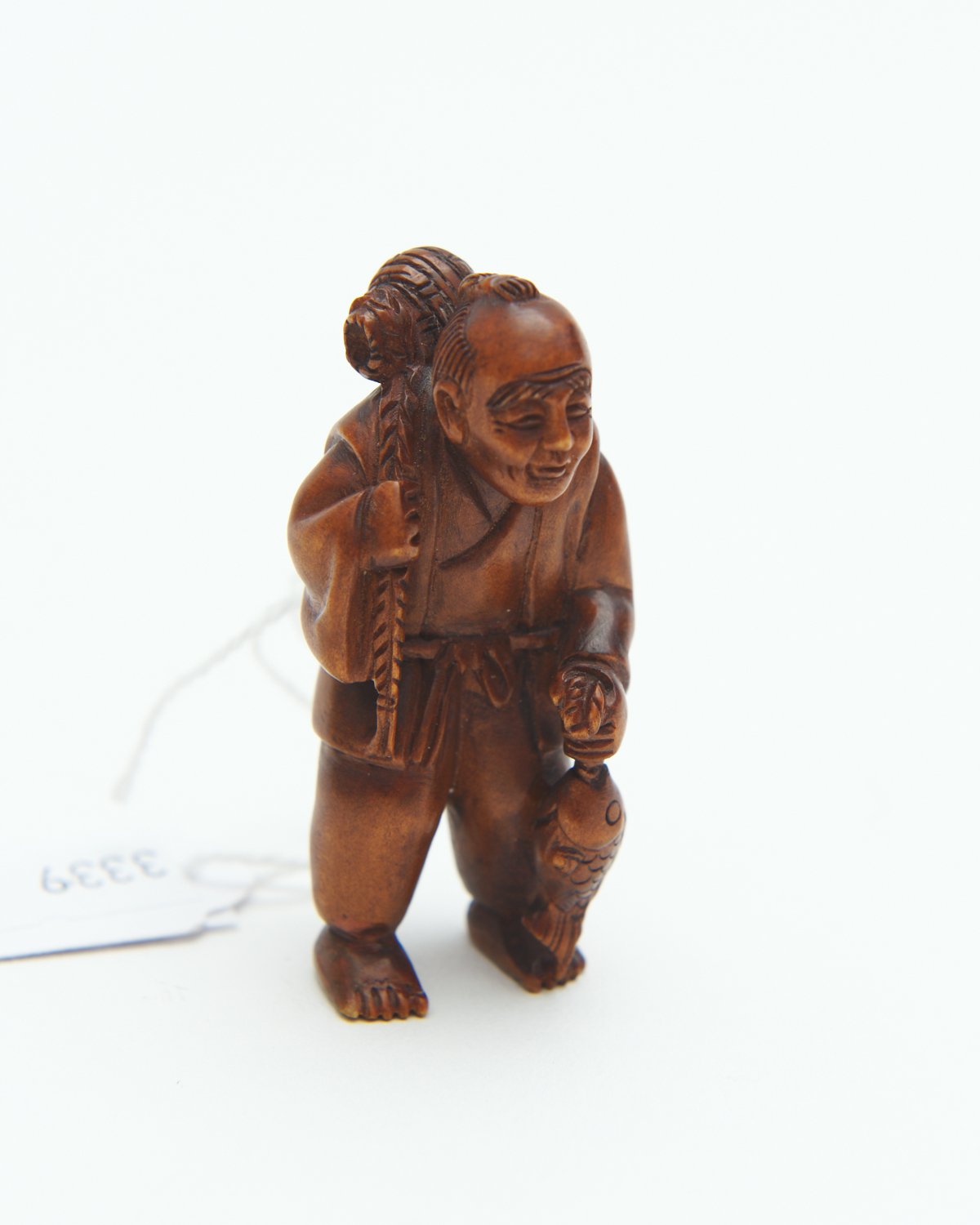 A JAPANESE BOXWOOD NETSUKE - MAN WITH FISH