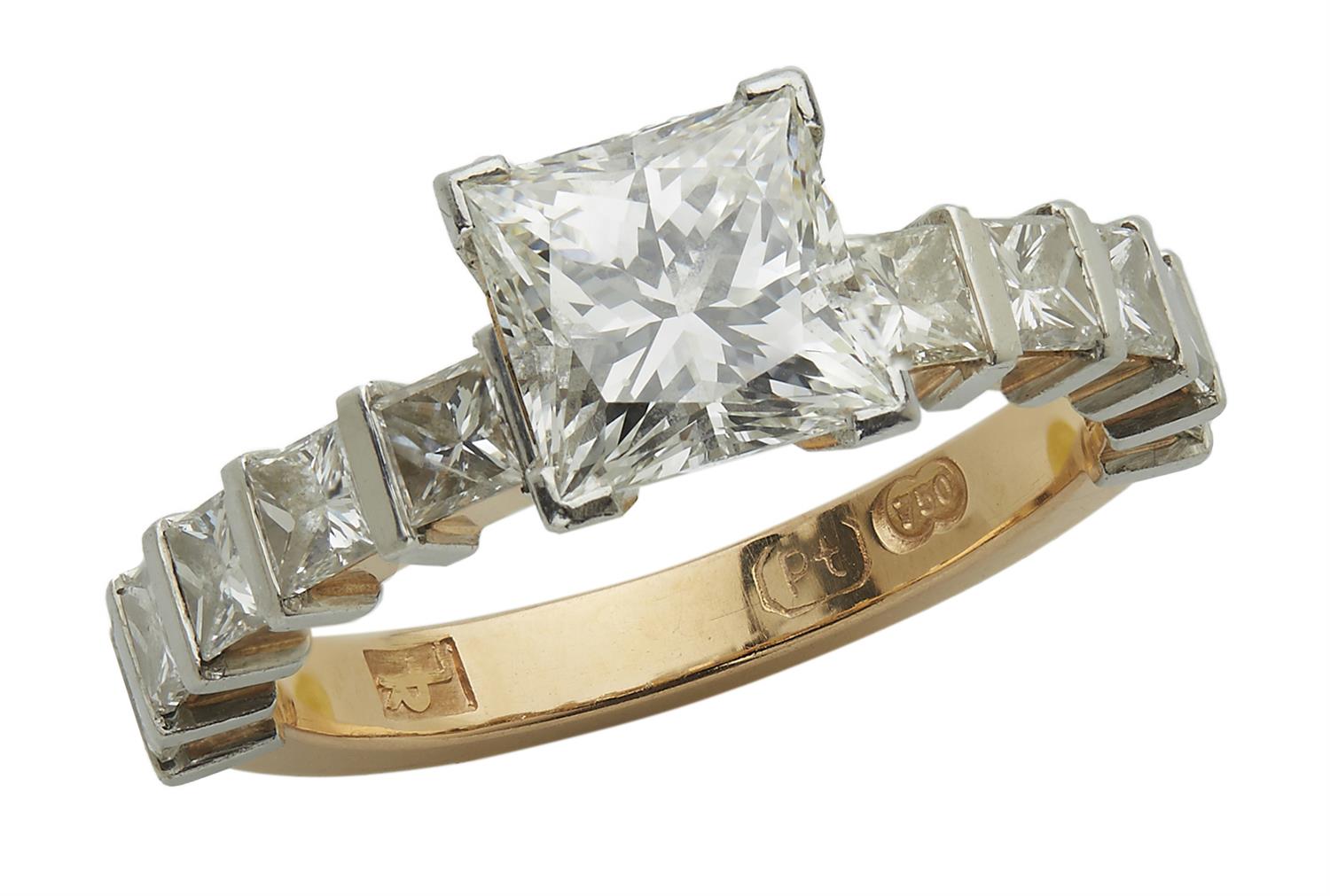 The princess-cut diamond weighing 1.62 carats is claw-set between a line of 10 similarly cut diamond shoulders, the small diamonds together weighing approximately 0.95 carats, size L, maker's mark FR for Fairfax and Roberts.