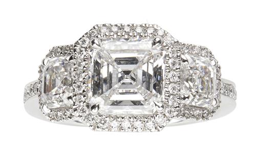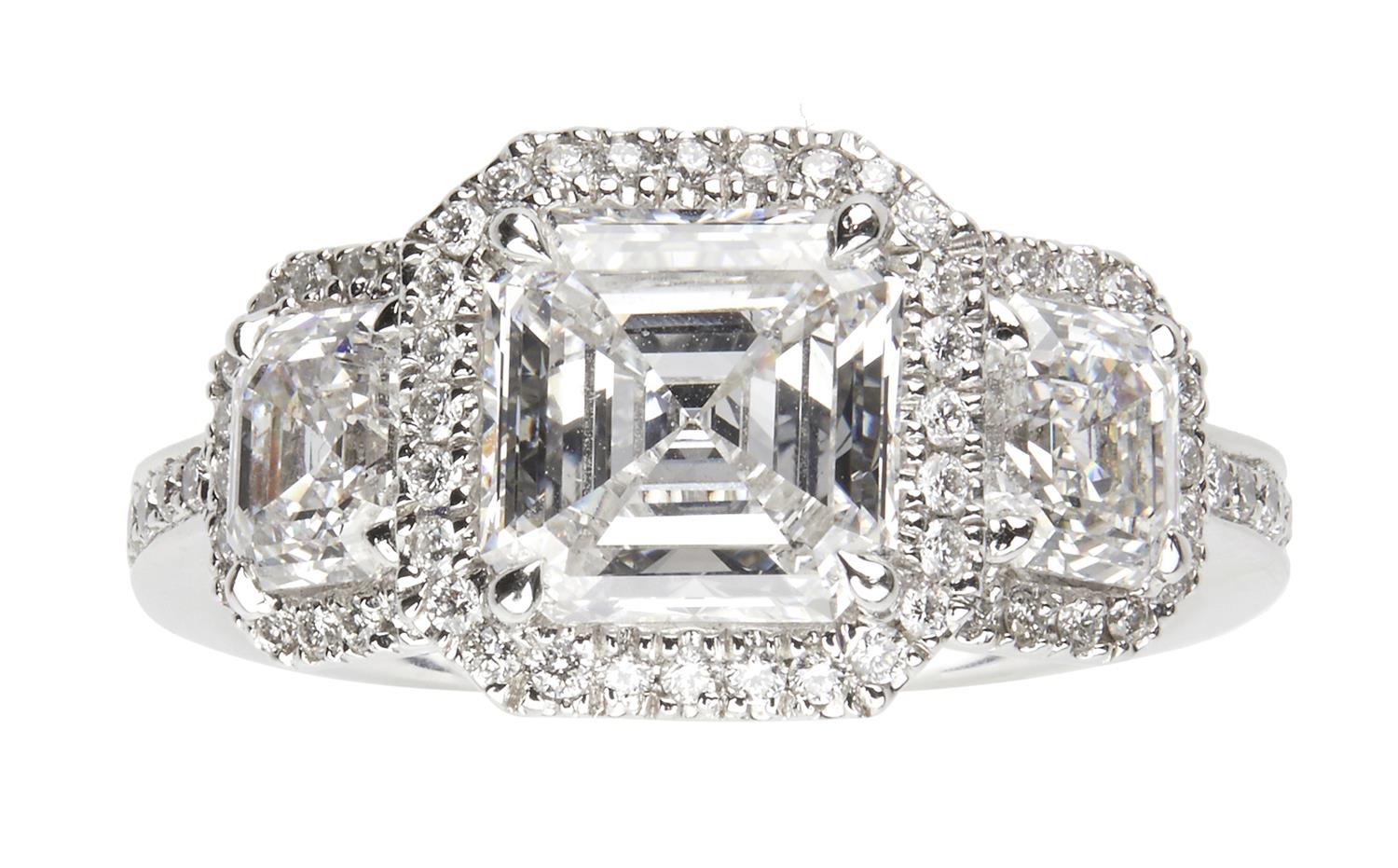 The three-stone diamond ring is claw-set to the centre with a square emerald-cut diamond weighing 1.81 carats between a pair of similarly cut diamonds each weighing 0.71 carats, framed by a line of brilliant-cut diamonds to similarly set shoulders, size M.