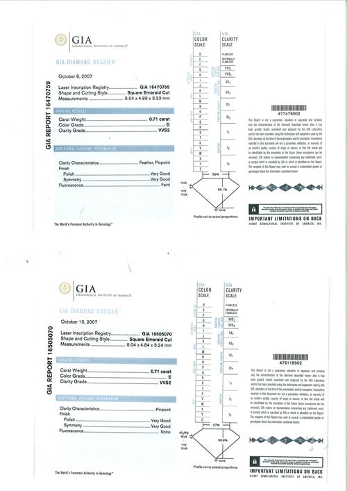 a GIA report numbered 16470759, dated 8 October 2007, stating that the 0.71 carat diamond is D colour, VVS2 clarity, laser inscribed;