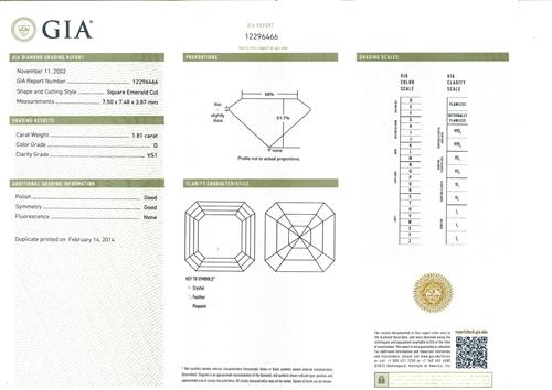 a GIA report numbered 12296466, dated 11 November 2002, stating that the 1.81 carat diamond is D colour and VS1 clarity, laser inscribed;