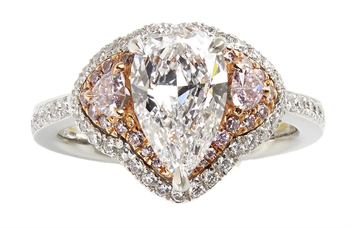 Of cluster design, centring a claw-set pear brilliant-cut diamond weighing 1.51 carats, flanked by an Argyle natural fancy pink heart-shaped diamond, partially framed by a line of Argyle natural fancy pink brilliant-cut diamonds, further framed by a line of near colourless brilliant-cut diamonds between similarly set shoulders, the reverse pavé-set with near colourless and pink diamonds, the near colourless and pink diamonds together weighing approximately 0.56 carats and 0.39 carats respectively, size L1/2.