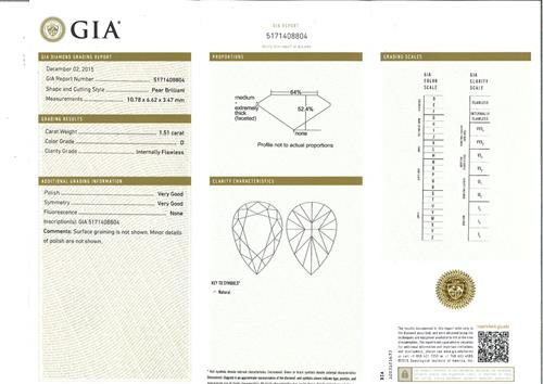 Accompanied by a GIA report numbered 5171408804, dated 2 December 2015, stating that the 1.51 carat diamond is D colour, and of Internally Flawless clarity, laser inscribed.