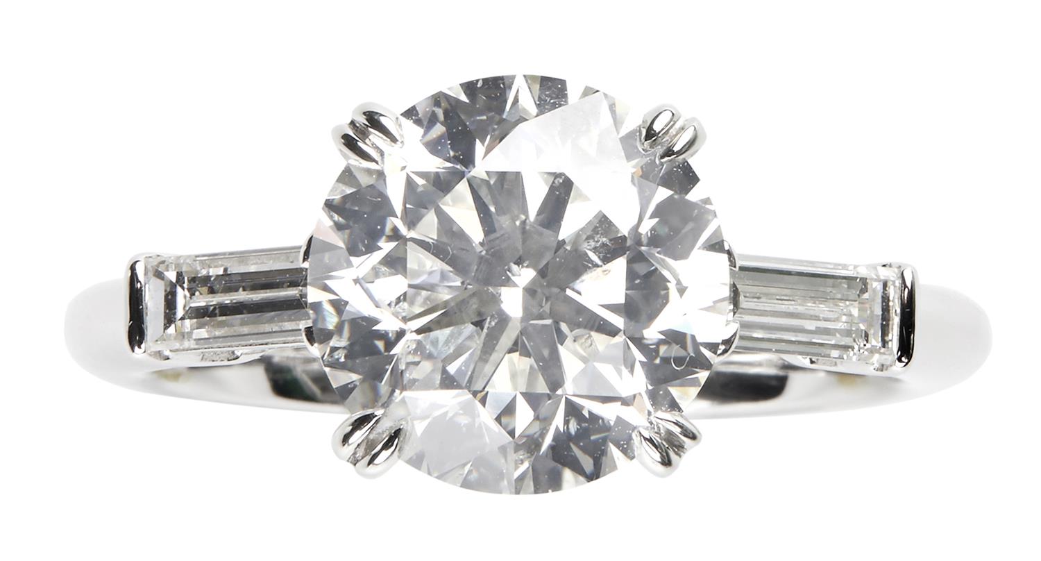 The brilliant-cut diamond weighing 3.02 carats is claw-set between a pair of baguette diamond shoulders together weighing approximately 0.34 carats, size L.