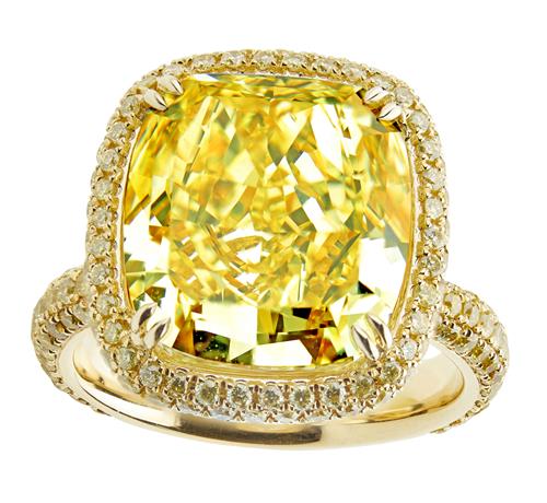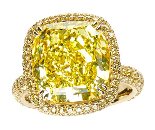 Of cluster design, centring a claw-set 9.02 carats cushion modified brilliant-cut natural fancy vivid yellow internally flawless diamond, framed by a line of natural fancy vivid yellow brilliant-cut diamonds, between similarly set shoulders and gallery, the under-rail further decorated by a pair of natural fancy intense pink brilliant-cut diamonds, the small yellow and pink diamonds together weighing approximately 1.39 carats and 0.09 carats respectively, size K1/2.