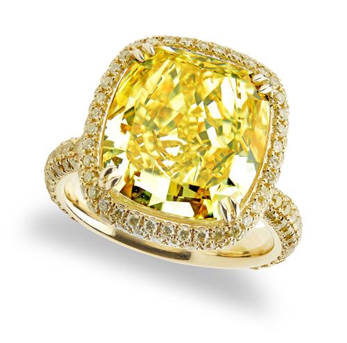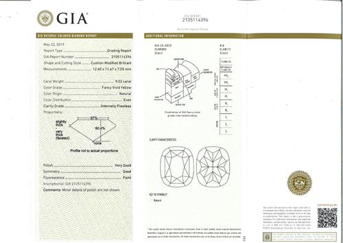 Accompanied by a GIA report numbered 2105114396, dated 2 May 2019, stating that the 9.02 carat diamond is of Fancy Vivid Yellow colour, Internally Flawless clarity, laser inscribed.