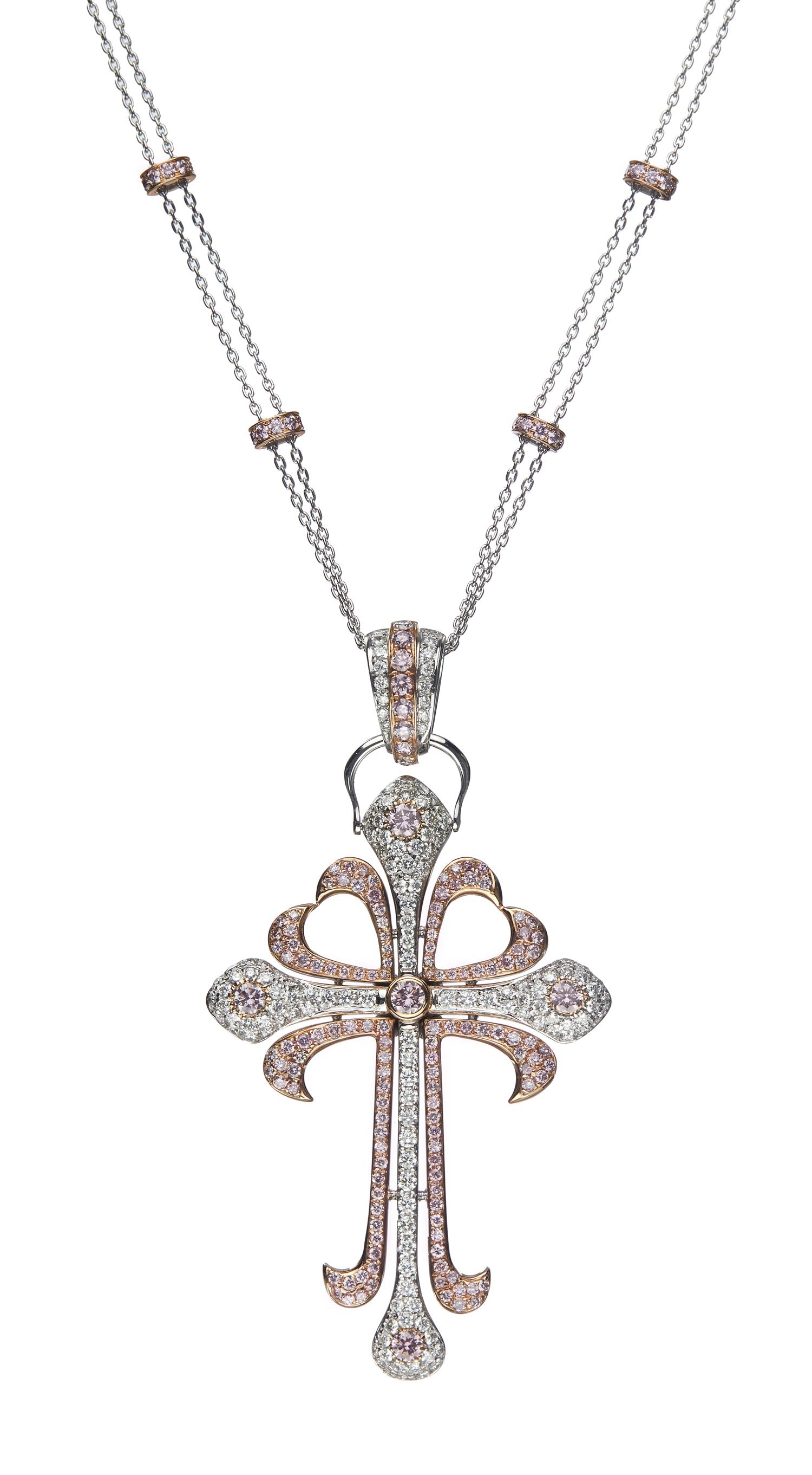Terminating on an openwork detachable cross pendant, decorated with Argyle natural fancy pink and near colourless brilliant-cut diamonds, supported from a double row white gold trace chain necklace, decorated at intervals with pink gold rondelles, embellished with Argyle natural fancy pink diamonds. The Argyle natural fancy pink and near colourless brilliant-cut diamonds together weighing approximately 1.52 carats and 1.34 carats respectively, cross length approximately 66mm, inner necklace circumference 400mm.