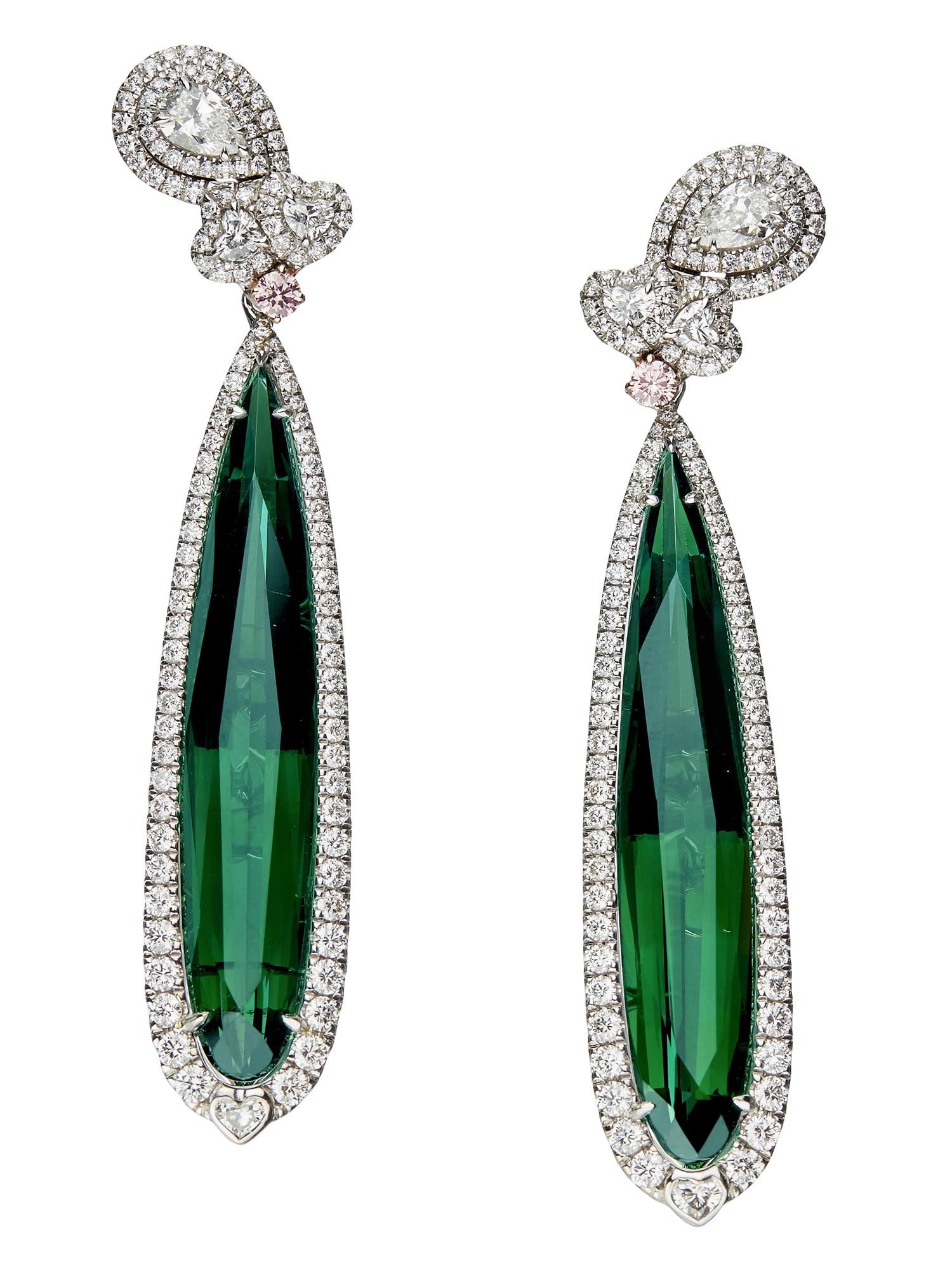 Each terminating in a detachable cluster swing drop, centring a drop-shaped green tourmaline, framed by a line of brilliant-cut diamonds, between a heart-shaped diamond, the reverse decorated with a pair of natural fancy pink brilliant-cut diamonds, supported from a pink diamond and near colourless diamond set cluster surmount, the tourmaline and diamonds together weighing approximately 21.15 carats and 2.97 carats respectively, length approximately 65mm, post and scroll fittings.