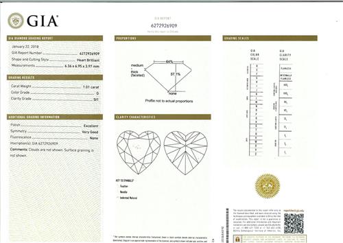 a GIA report numbered 6272926909, dated 22 January 2018, stating that the 1.01 carat diamond is G colour and SI1 clarity, laser inscribed.
