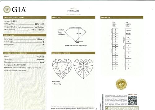 a GIA report numbered 2276926131, dated 22 January 2018, stating that the 1.01 carat diamond is G colour and SI1 clarity, laser inscribed;