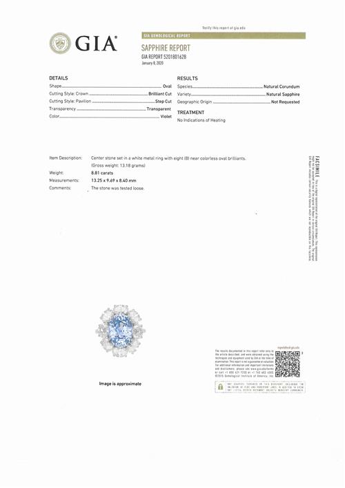 Accompanied by a GIA report numbered 5201801628, dated 8 January 2020, stating that the 8.81 carat sapphire is violet in colour, natural, with no indications of heat treatment.