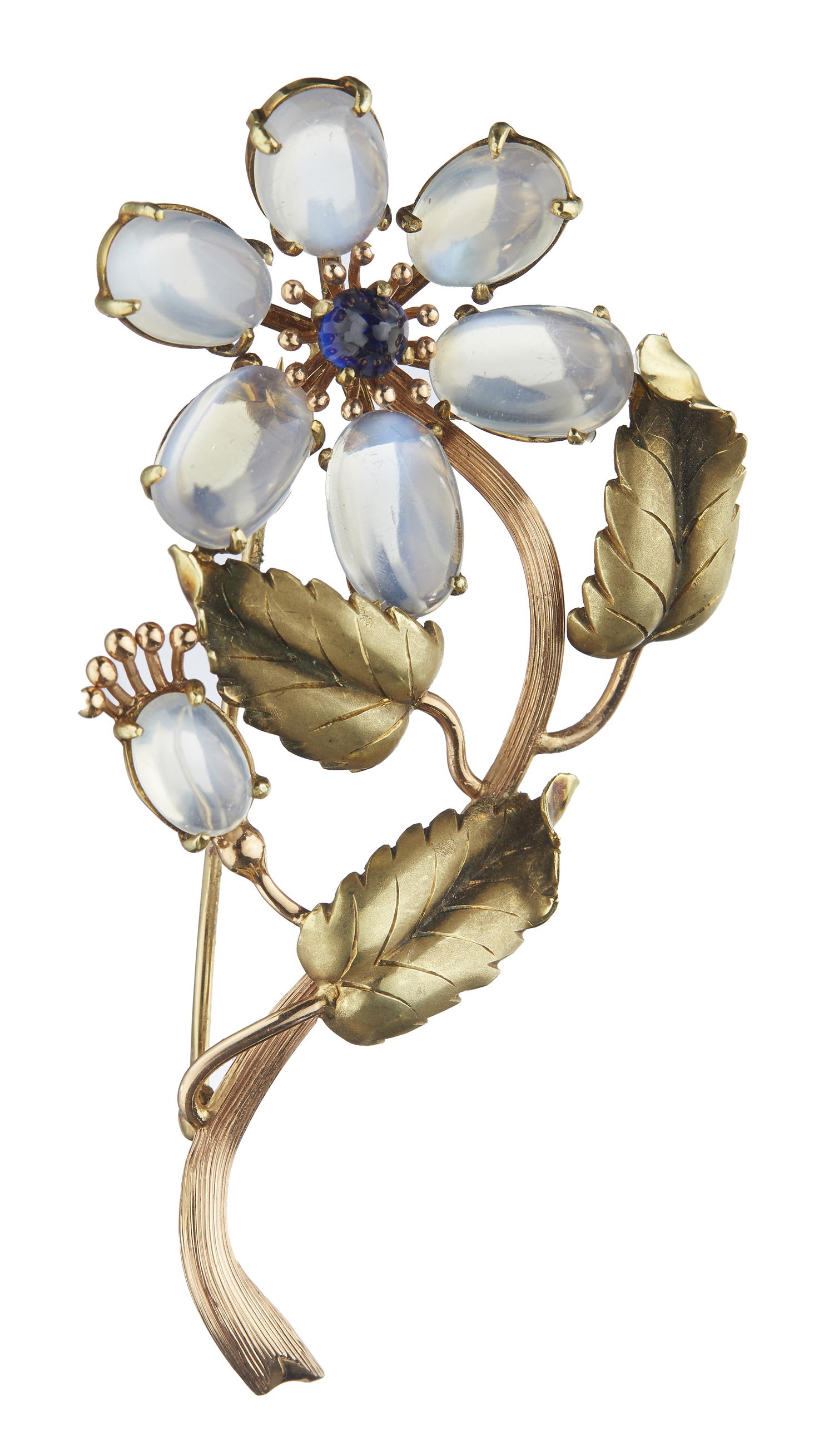 Designed as a floral spray, comprising a flower head, centring a claw-set cabochon sapphire, the petals modelled as a line of oval moonstones accented by a spray of textured leaves, a bud further embellished with a moonstone, length approximately 78mm, signed Tiffany & Co.