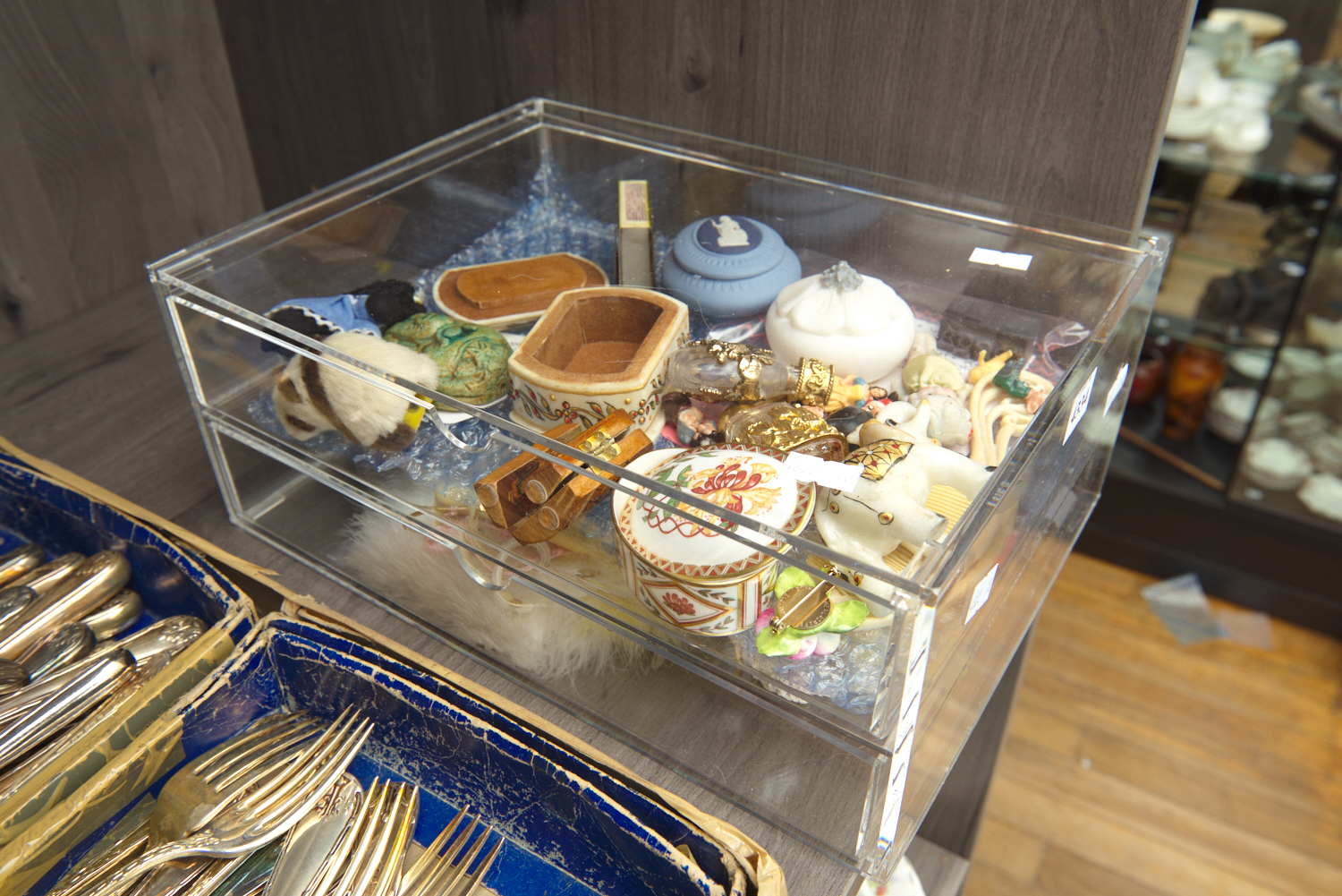 A PERSPEX BOX FULL OF VARIOUS TRINKETS, FANS ETC