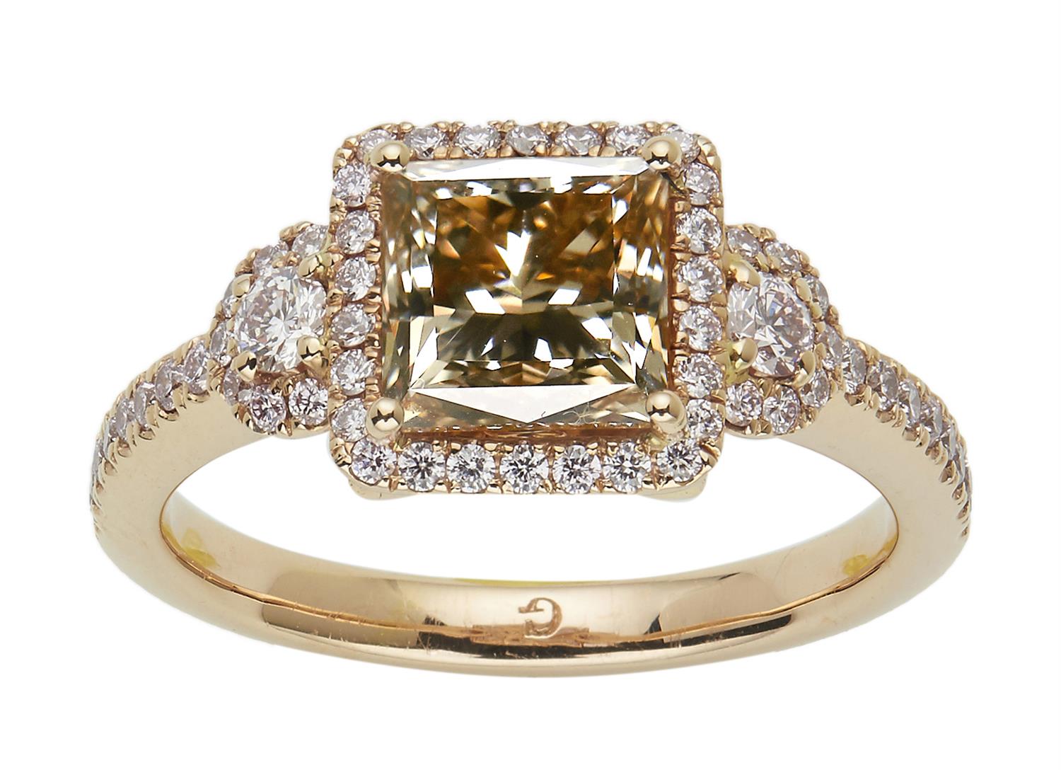 Of cluster design, claw-set to the centre with an Argyle natural fancy light brown princess-cut diamond stated to weigh 2.02 carats framed by a line of Argyle natural fancy pink brilliant-cut diamonds, the shoulders and gallery similarly set, the pink diamonds together stated to weigh 0.57 carats, size M1/2.