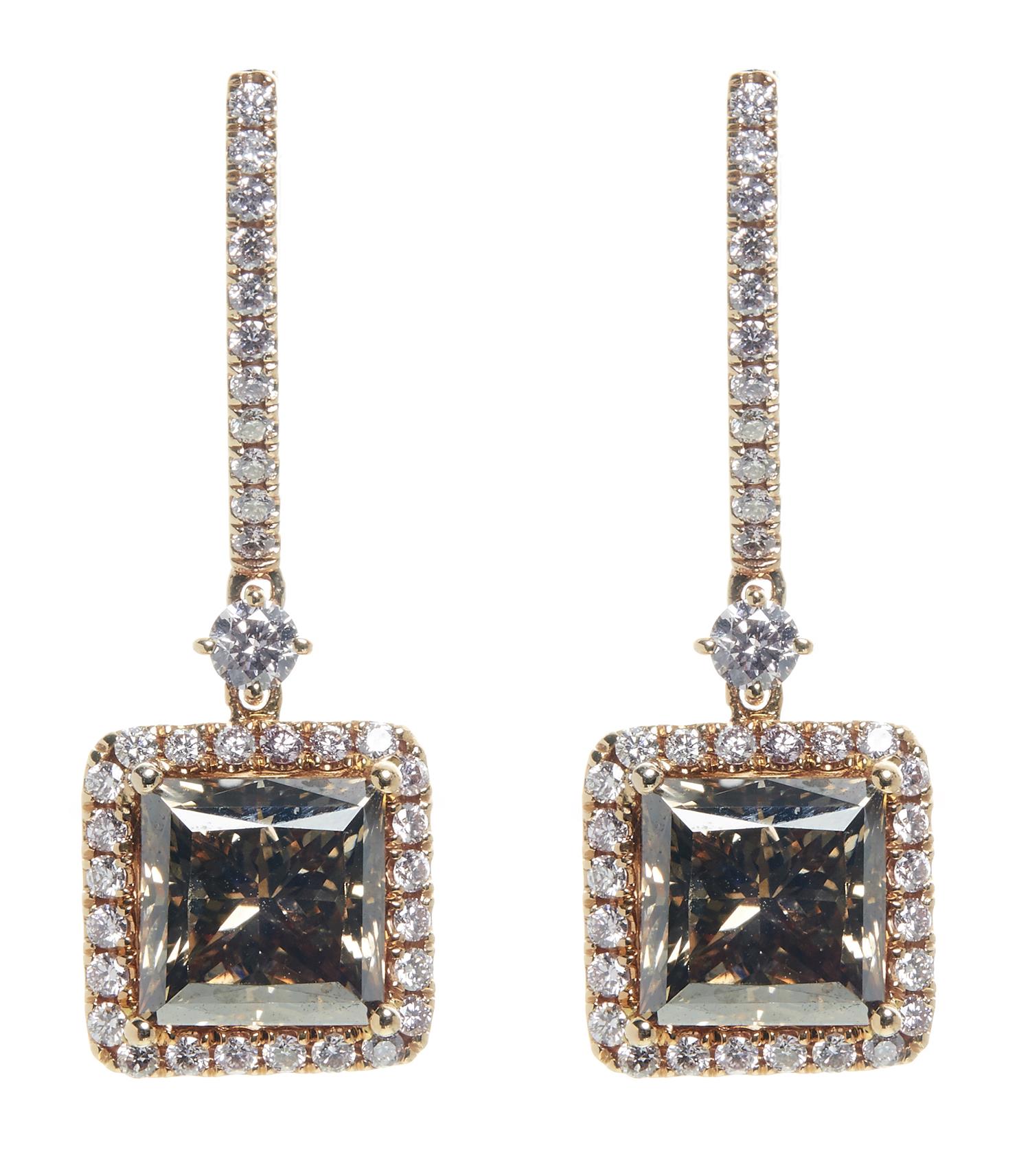 Each terminating on a cluster swing drop claw-set with an Argyle natural fancy dark yellowish brown and dark orange brown princess-cut diamond weighing 2.07 carats and 2.02 carats respectively, framed by a line of Argyle natural fancy pink brilliant-cut diamonds, the reverse decorated with a floral motif embellished with pink brilliant-cut diamonds, surmounted by an elliptical hoop, pavé-set with near colourless diamonds between a diamond set connect, length approximately 30mm.