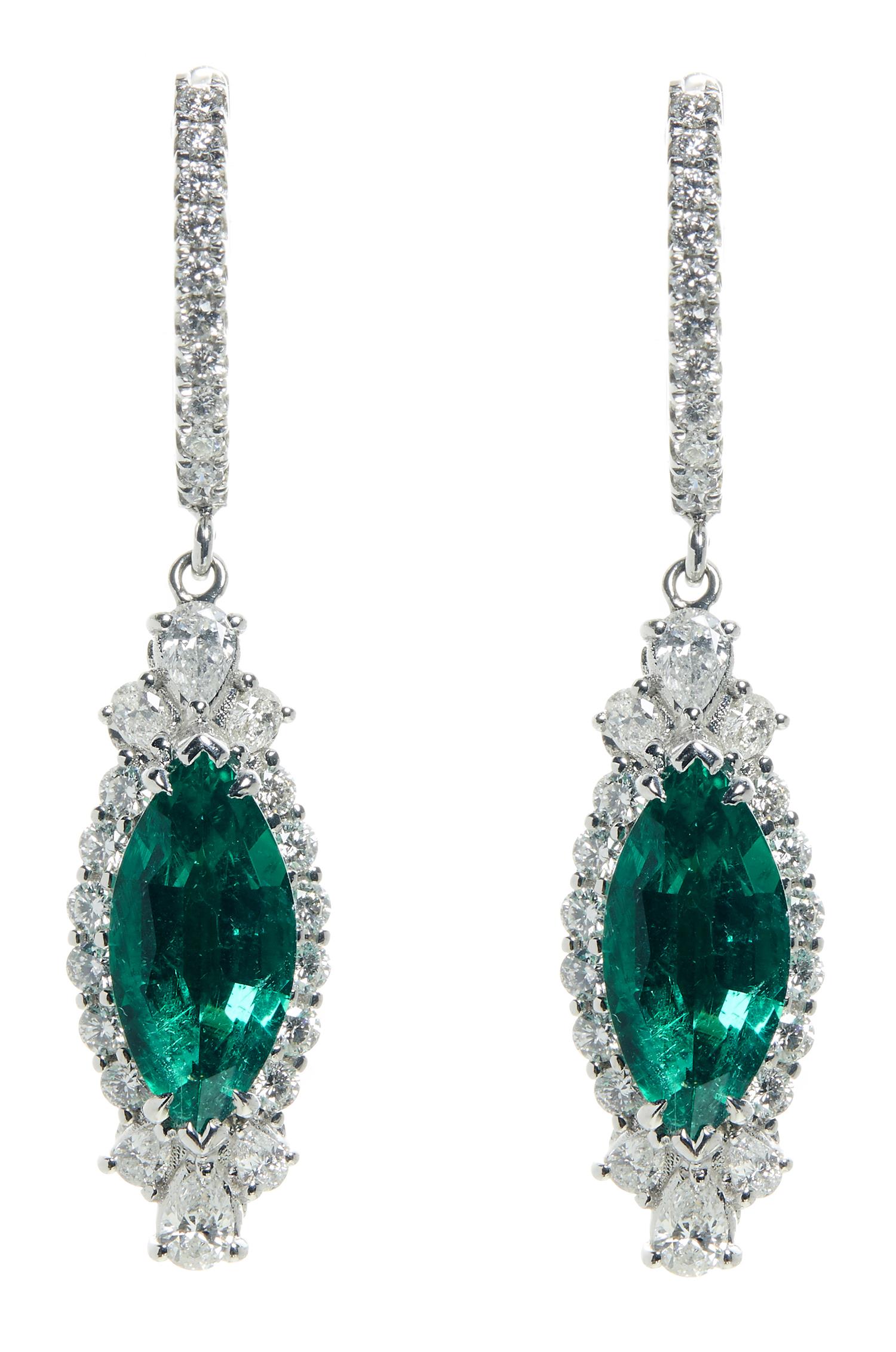 Each terminating in a claw-set marquise-shaped emerald framed by a line of brilliant-cut diamonds between pear-shaped diamonds, supported from an elliptical hoop surmount pavé-set with brilliant-cut diamonds, the emeralds and diamonds together stated to weigh 2.75 carats and 1.12 carats respectively, length approximately 38mm.