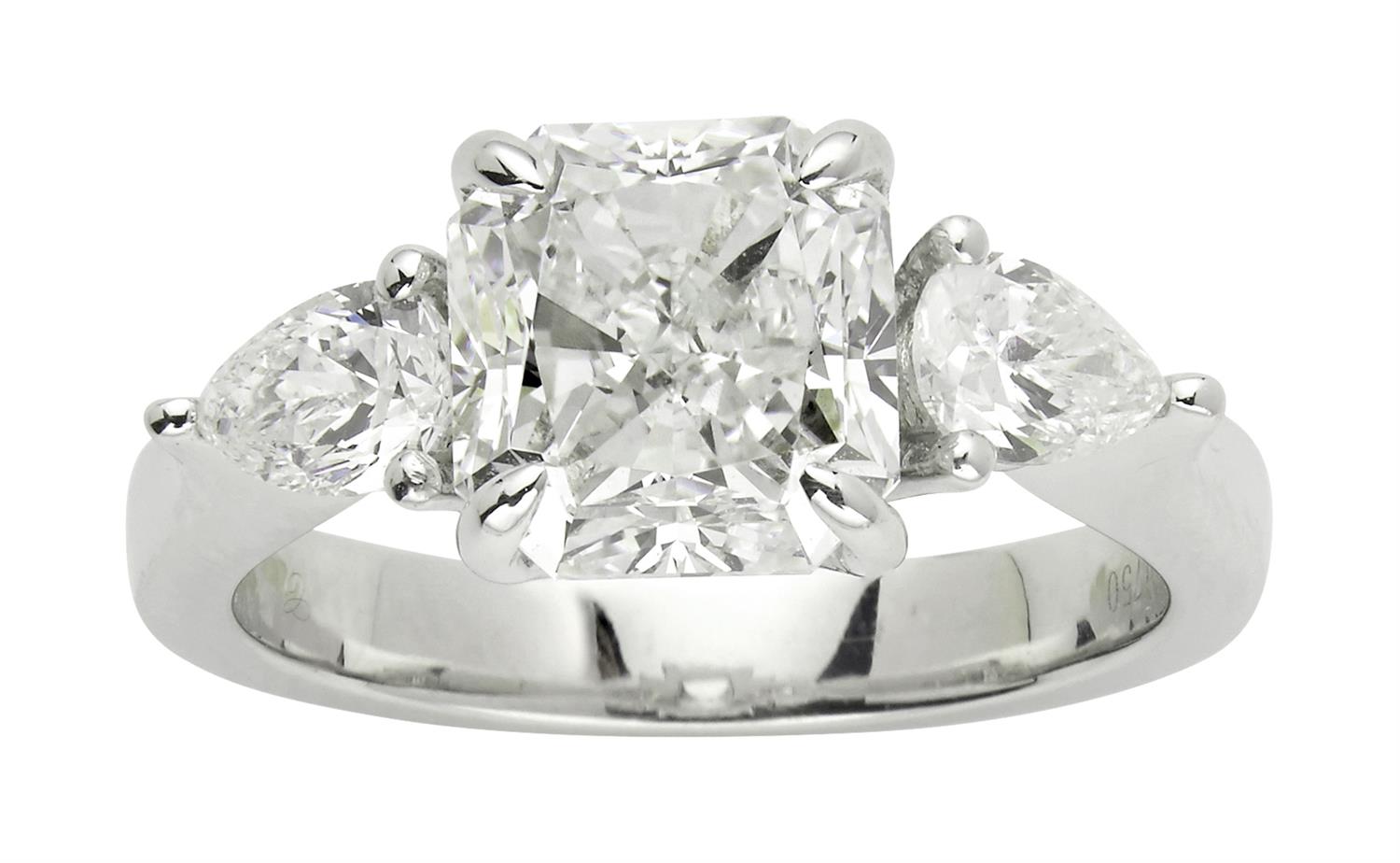 The radiant-cut diamond weighing 3.03 carats is claw-set between a pair of pear-shaped diamond shoulders, together weighing approximately 0.60 carats, size L.