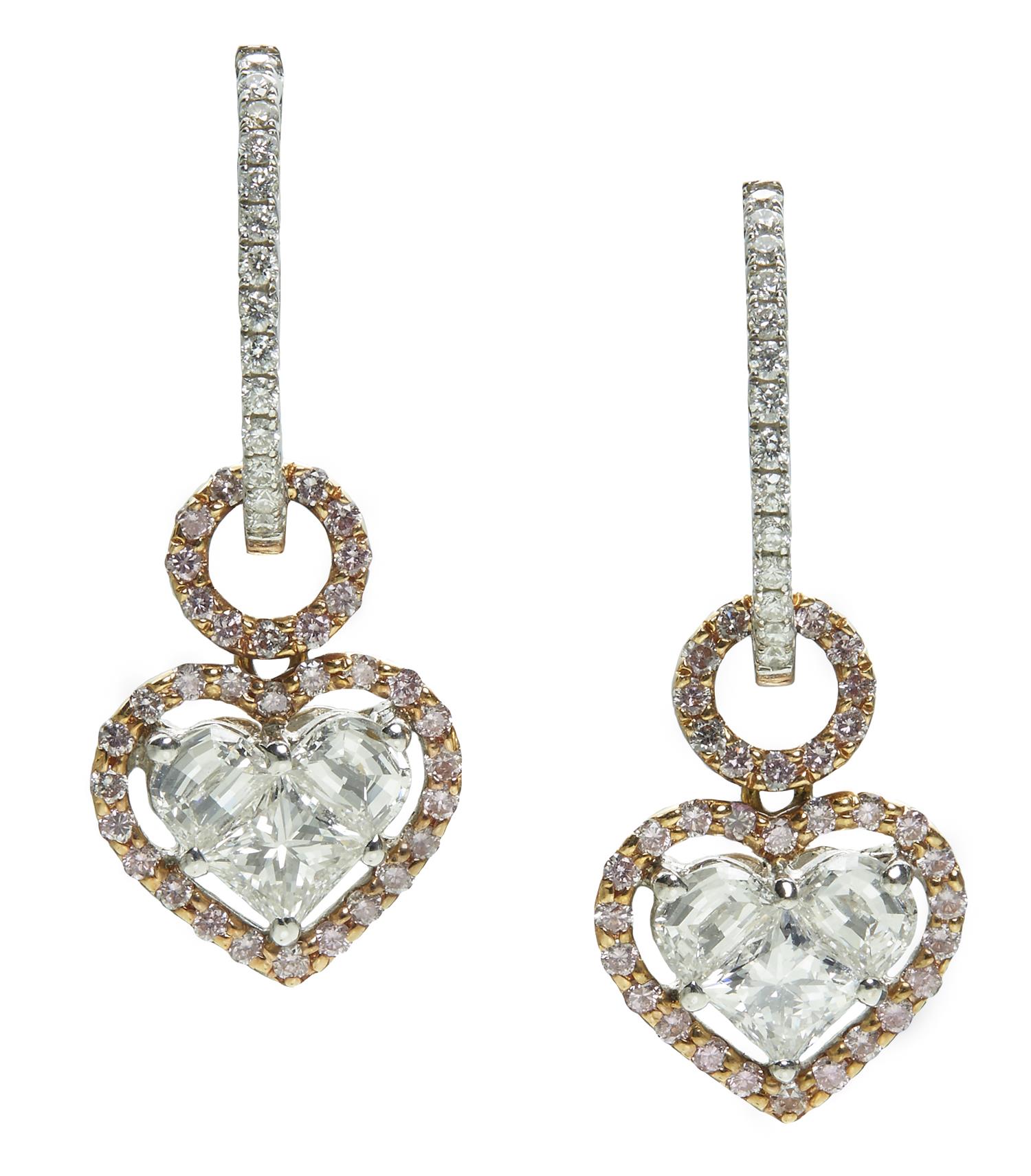 Each terminating on a detachable openwork heart-shaped pendant swing drop centring a cluster of princess-cut and half-moon shaped diamonds, framed by a line of natural fancy pink brilliant-cut diamonds, surmounted by a similarly set annular hoop, supported from a hinged circular hoop pavé-set with near colourless diamonds, the small diamonds together stated to weigh 0.67 carats, length approximately 25mm, post fittings.