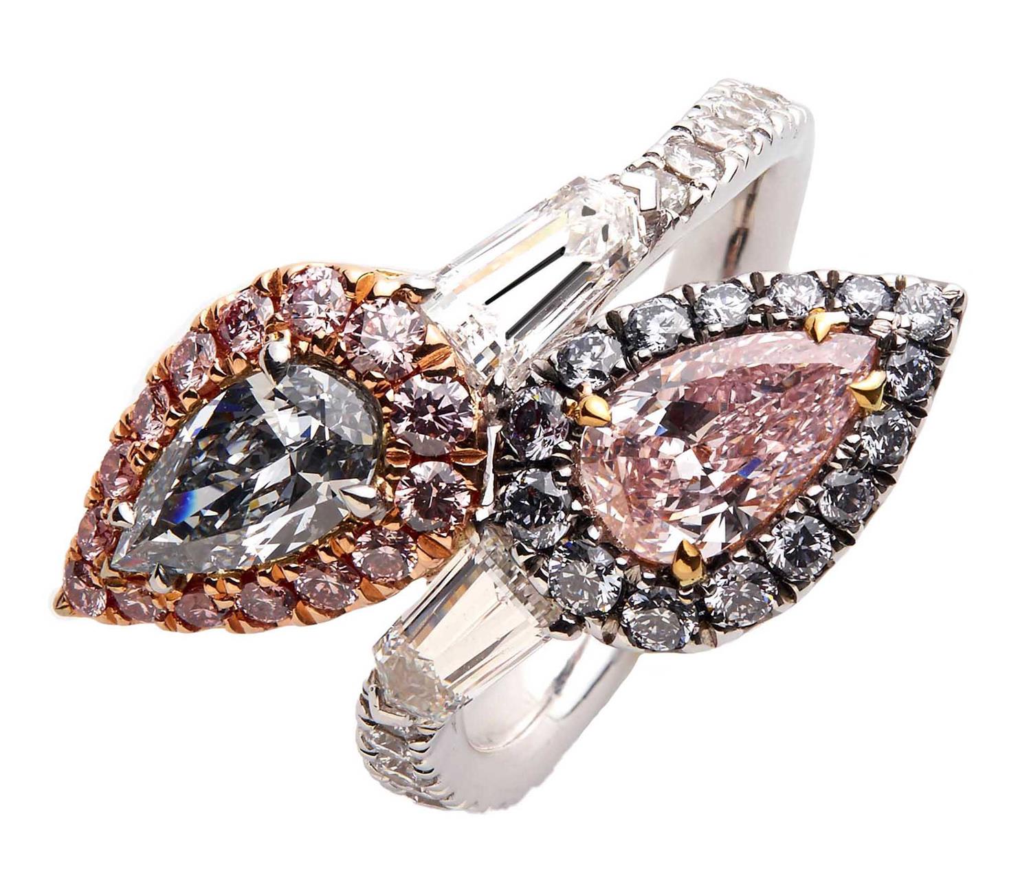 Of toi et moi design with cluster terminals, one claw-set with a pear modified brilliant-cut natural fancy pink diamond weighing 0.77 carats, framed by natural fancy blue brilliant-cut diamonds, the other similarly set with a pear modified brilliant-cut natural fancy gray-blue diamond, weighing 0.53 carats, framed by natural fancy pink brilliant-cut diamonds, between shoulders accented by near colourless bullet shaped and brilliant-cut diamonds, the under-rail modelled as openwork hearts pavé-set with the natural fancy pink diamonds, the small diamonds together weighing approximately 2.22 carats, size L.