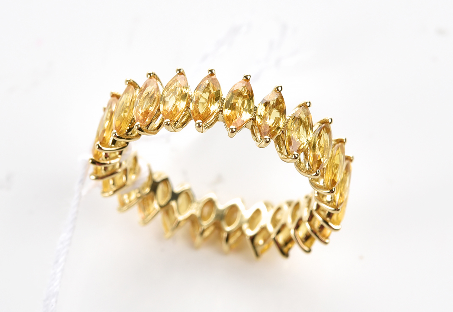 A MARQUISE YELLOW SAPPHIRE ETERNITY RING IN 18CT GOLD, THE SAPPHIRES TOTALLING 4.50CTS, SIZE L, 2.3GMS