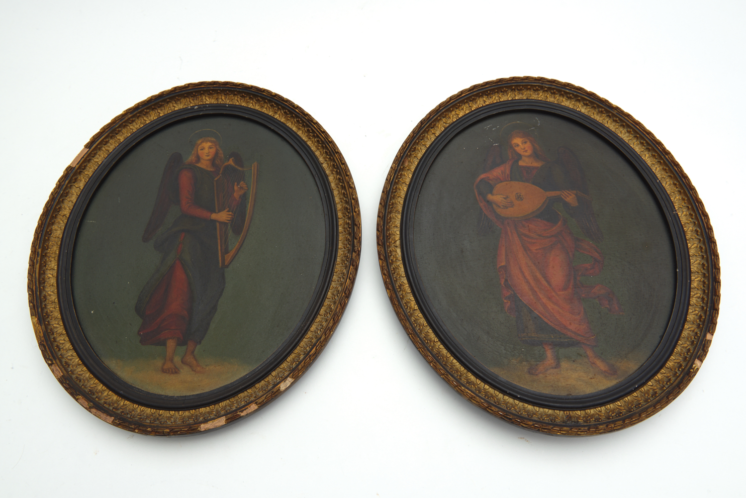A PAIR OF ITALIAN CLASSICAL STYLE PAINTED PLAQUES IN GILT AND EBONISED FRAMES (LOSSES TO FRAMES) 40 x 33cm
