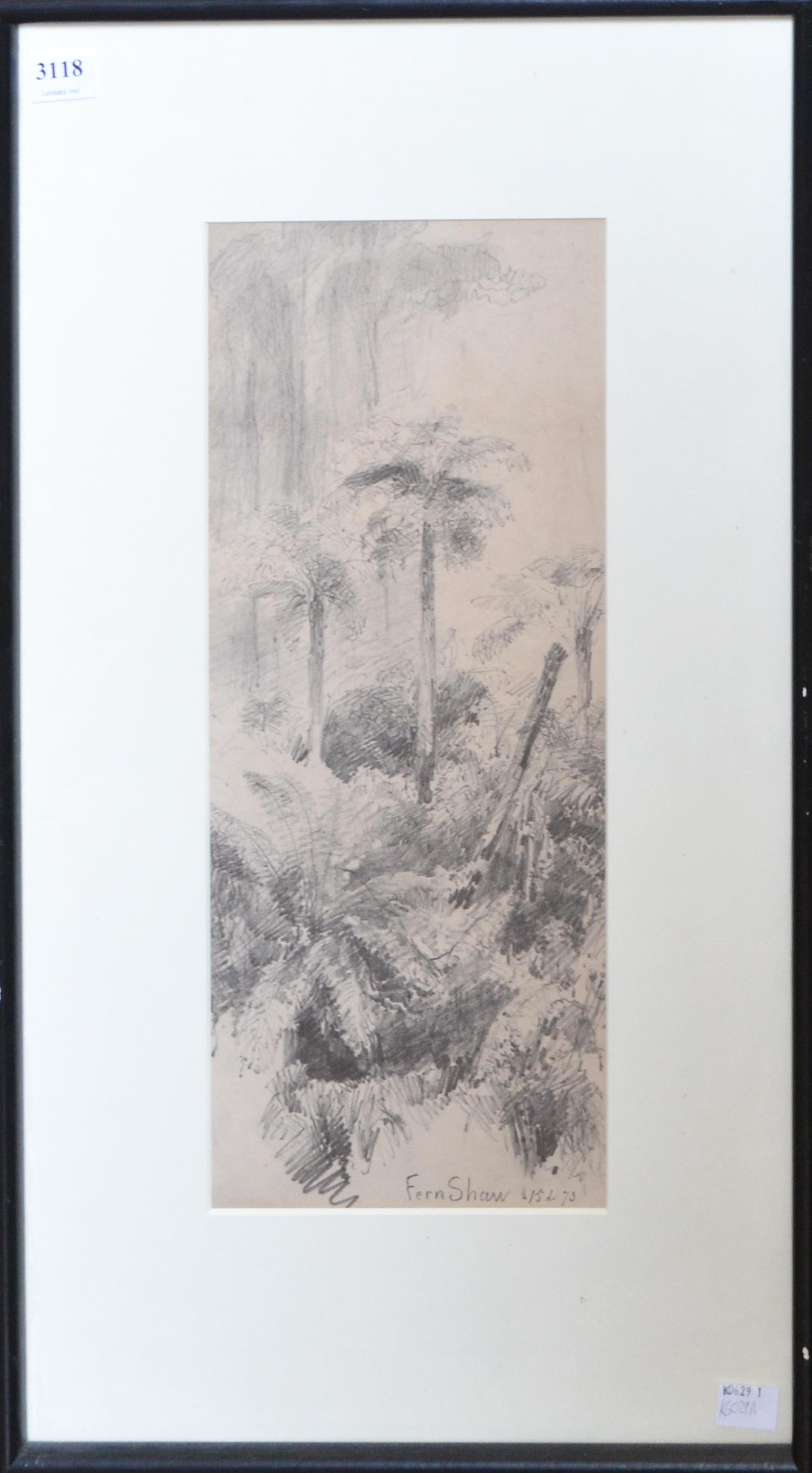 ATTRIBUTED TO LOUIS BUVELOT, FERN SHAW 1873, PENCIL ON PAPER, BEARS INSCRIPTION AT BASE: FERN SHAW 73, 37 X 15CM